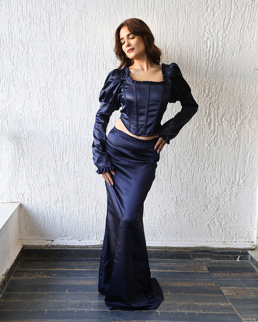 Navy Blue Puff Sleeve Corset & Satin Skirt