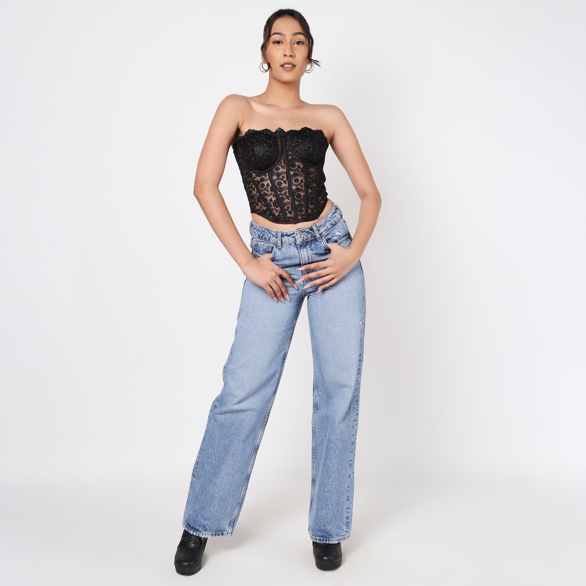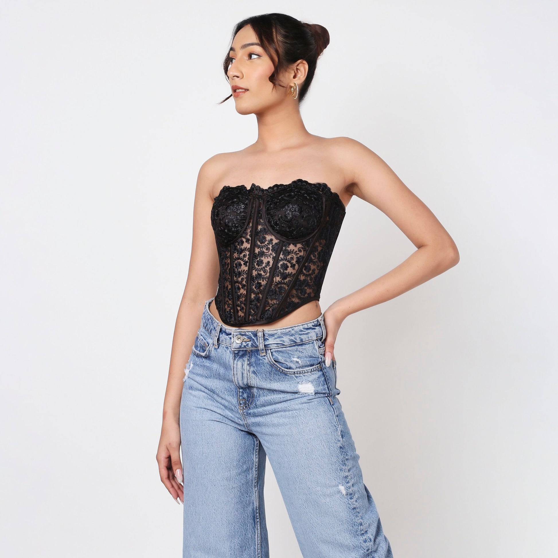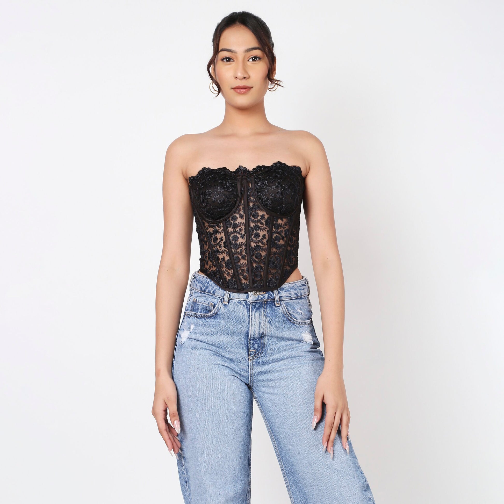 Our 50 shades of black corset is made from lacey material that'll make you feel your most glamorous as soon as you slip it on. It has a décolletage baring strapless bodice and the sculptural boning defines your waist. The pretty lace up back allows you to control the fit and we love this paired with jeans or skirt for a more glam vibe.