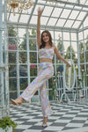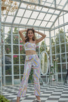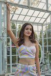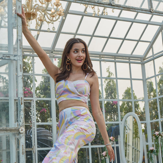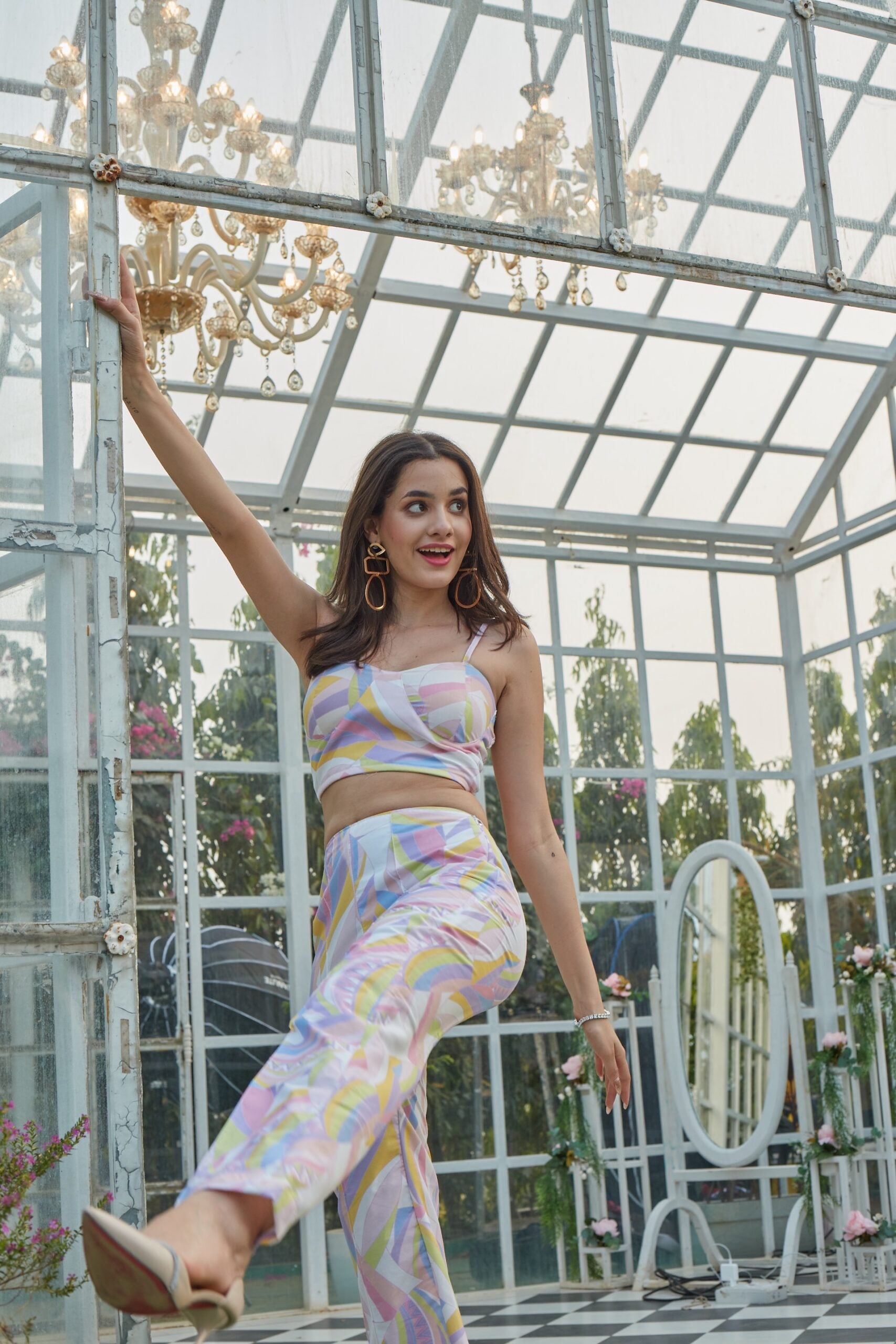 A stunning and stylish set featuring a padded corset top paired with matching pants. The abstract multicolor design makes this set a bold statement for any occasion.