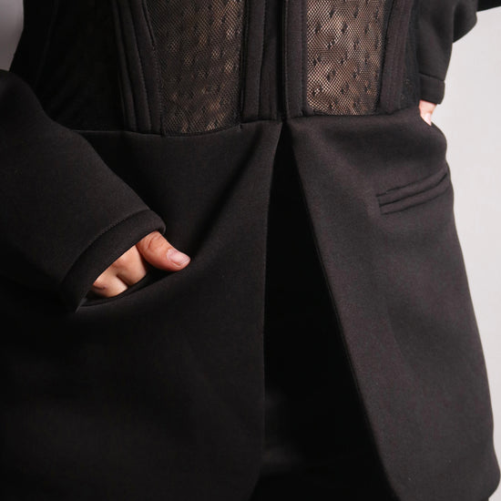 A detailed scuba corset Blazer Top with Mesh detailing and corsetry which cinches the waist ,