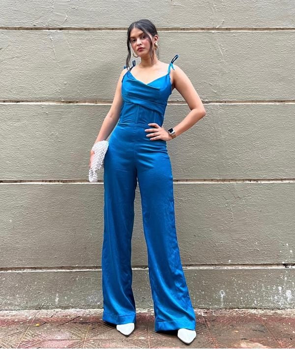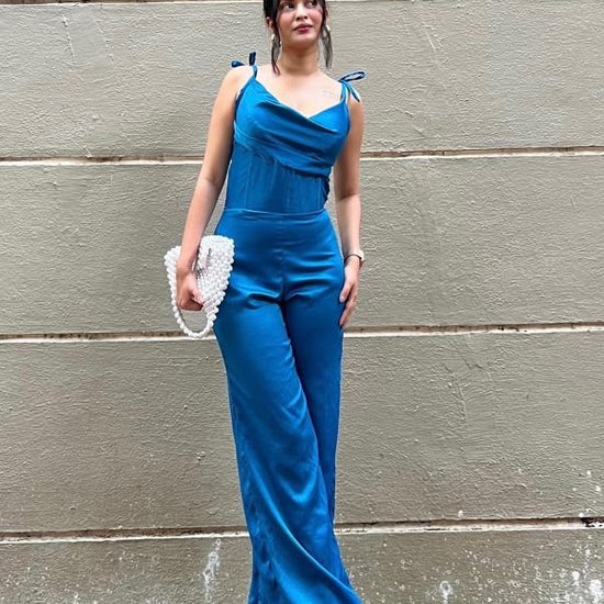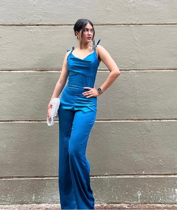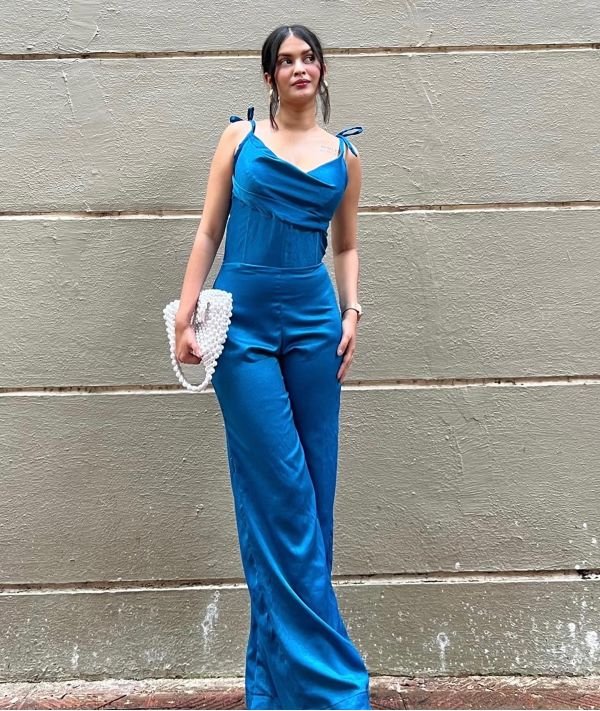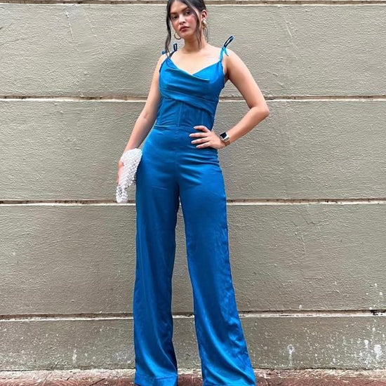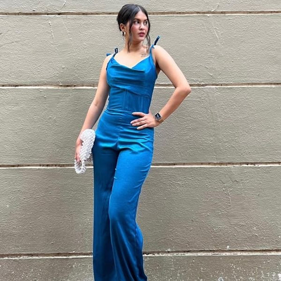 Our corset jumpsuit is a glamorous work of art. Cut from satin, it has a flattering strapless neckline, and the boned bodice is softened by the gathered skirt overlay and draped panel that falls effortlessly passed the hem, highlighting just how glossy the satin is. It skims over your curves and zips to the back for easy on.