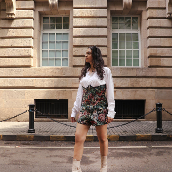 A beautiful vintage core vibe Underbust Corset and shorts with a embroidered detail shirt