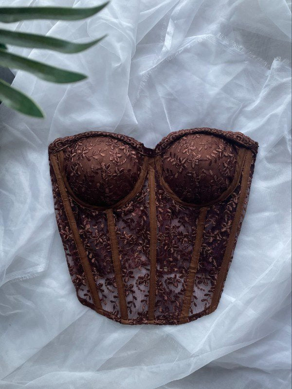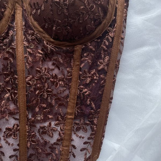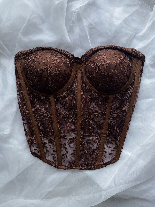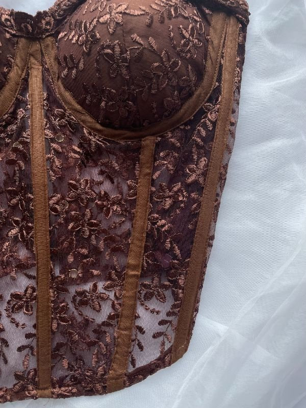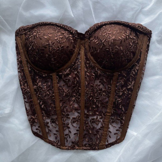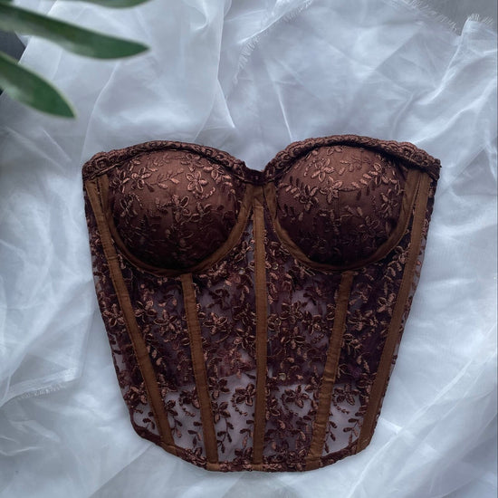 Our Brown Baddie corset is made from Lacey Material that'll make you feel your most glamorous as soon as you slip it on. It has a décolletage baring strapless bodice and the sculptural boning defines your waist. The pretty lace up back allows you to control the fit and we love this paired with jeans or skirt for a more glam vibe.