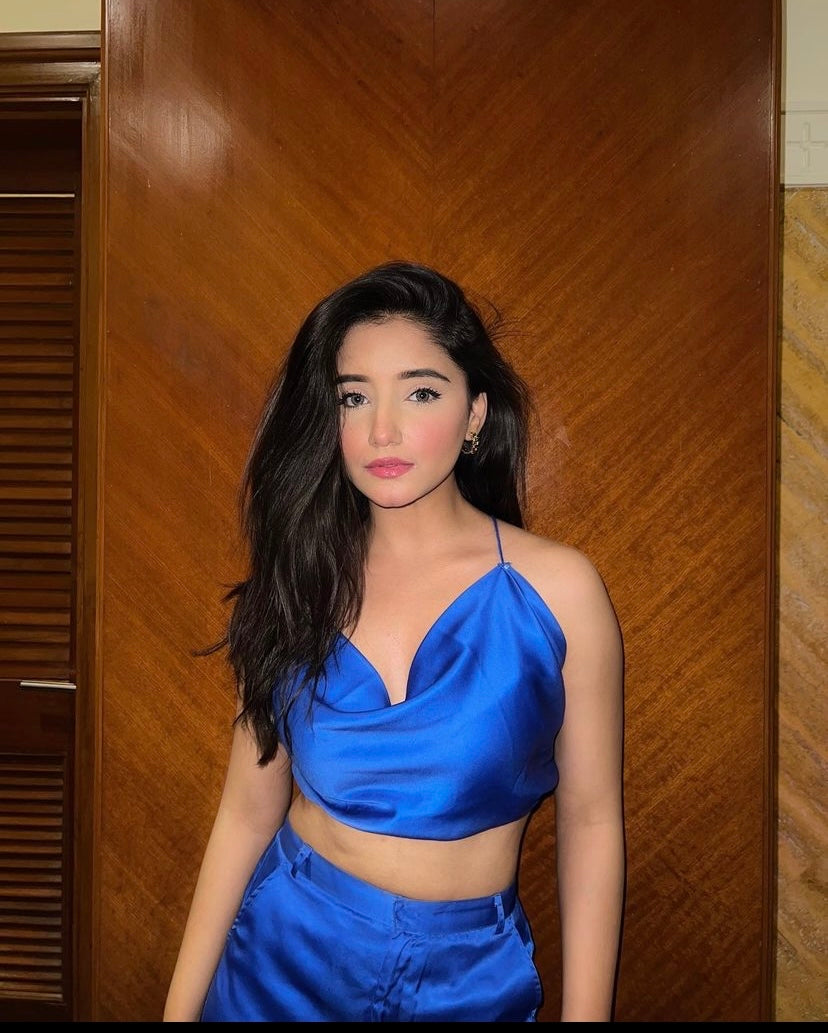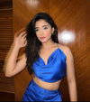 A stunning blue satin co-ord set, as worn by the gorgeous Rachie Sharma. The set features a drawstring closure, blending elegance with a comfortable fit