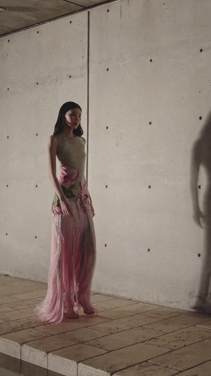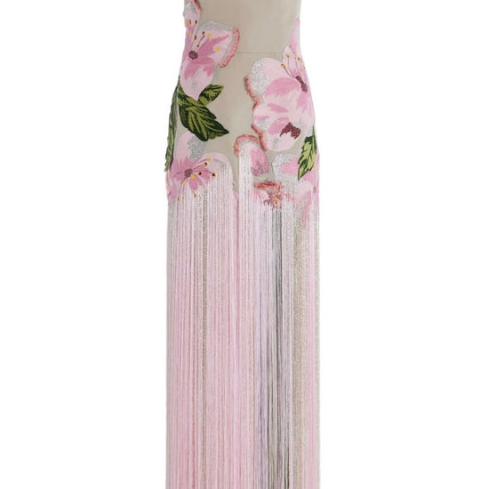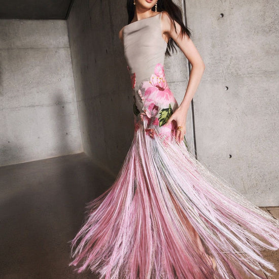 Elevate your eveningwear with this handcrafted ombré fringe gown, an artistic fusion of texture, color, and modern couture craftsmanship. The strapless silhouette features a structured ivory bodice that gracefully transitions into a cascade of multicolored thread fringes in vivid shades of burnt orange, lilac, navy, and blush.
