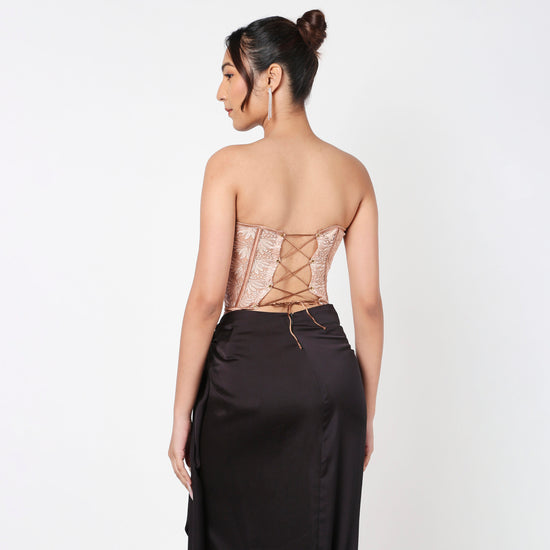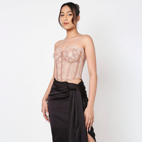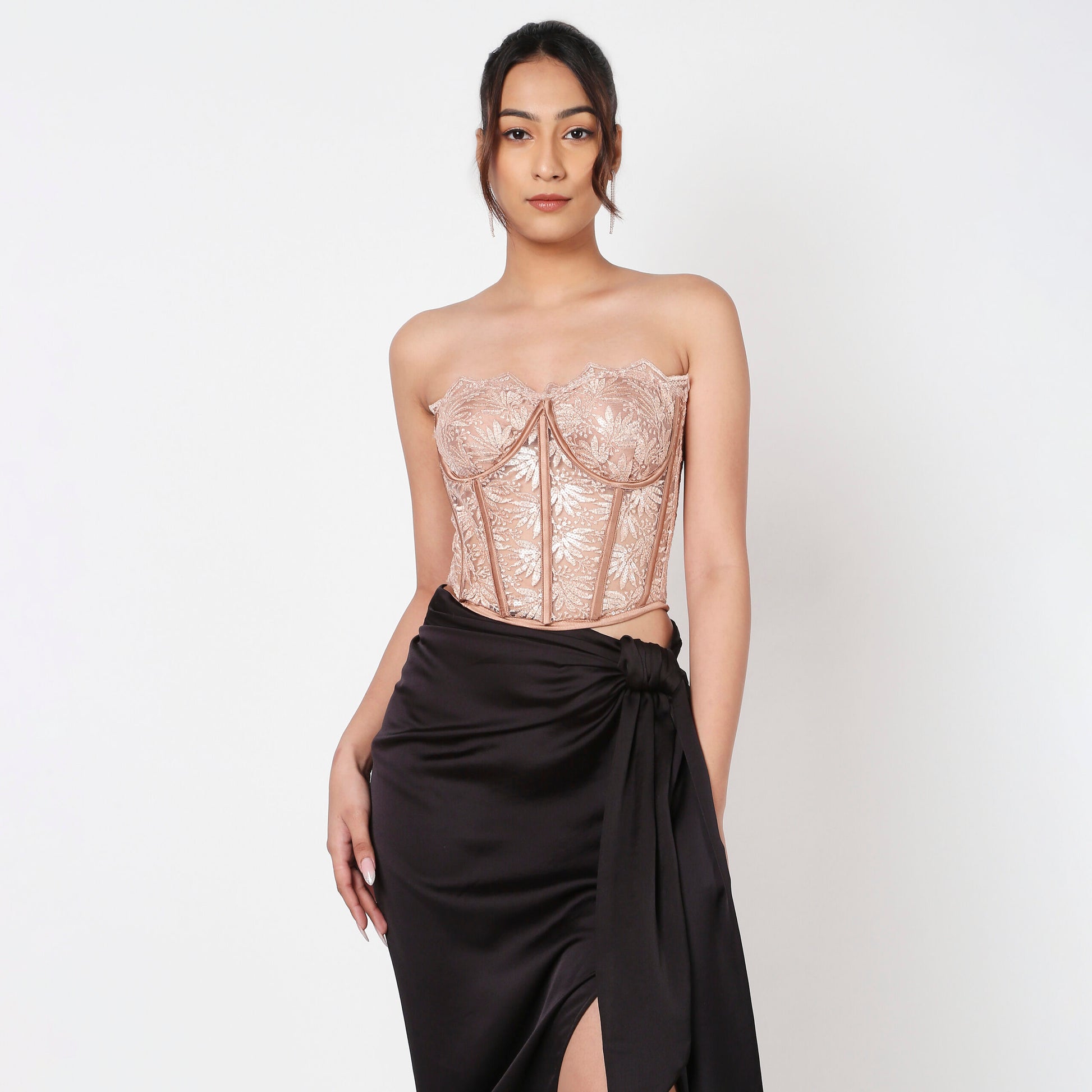 The Champagne Beige Lacey Corset is perfect for adding a touch of grace and sophistication to any look.