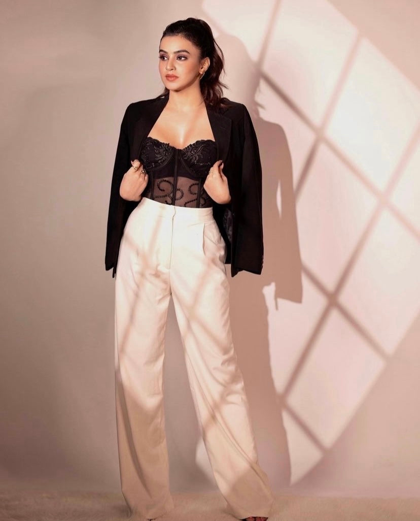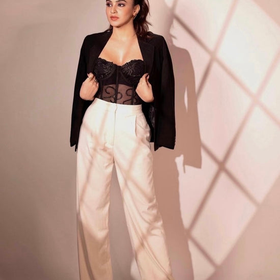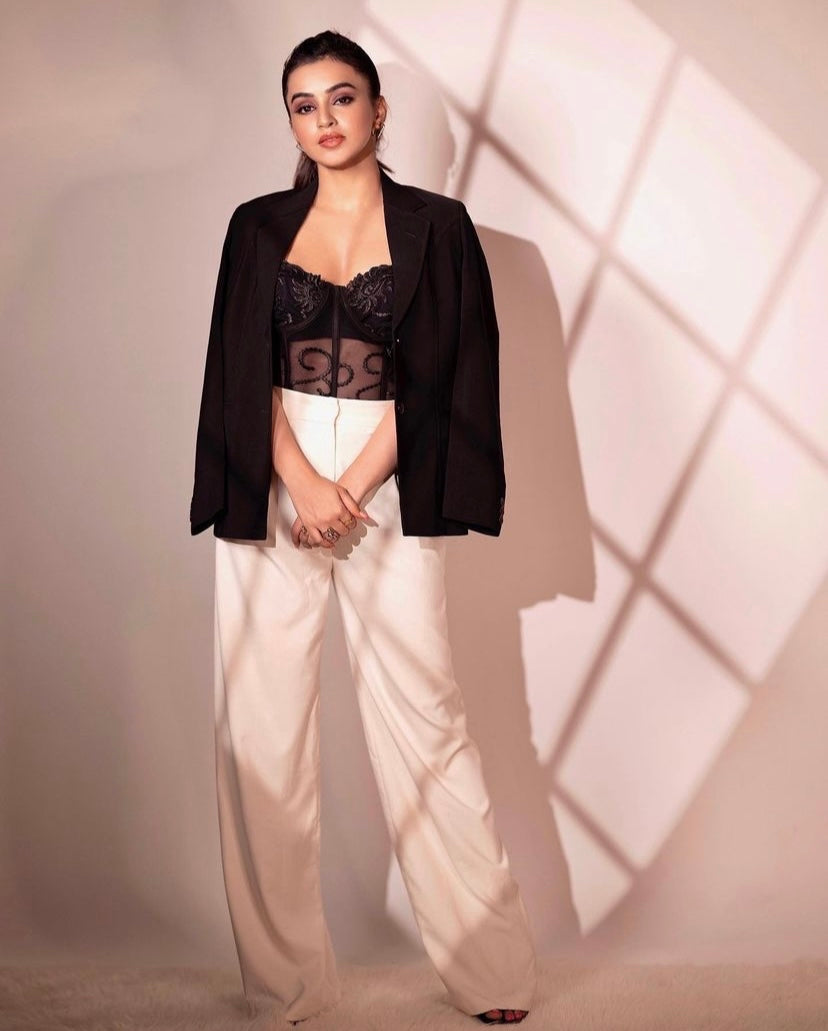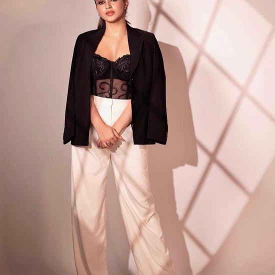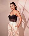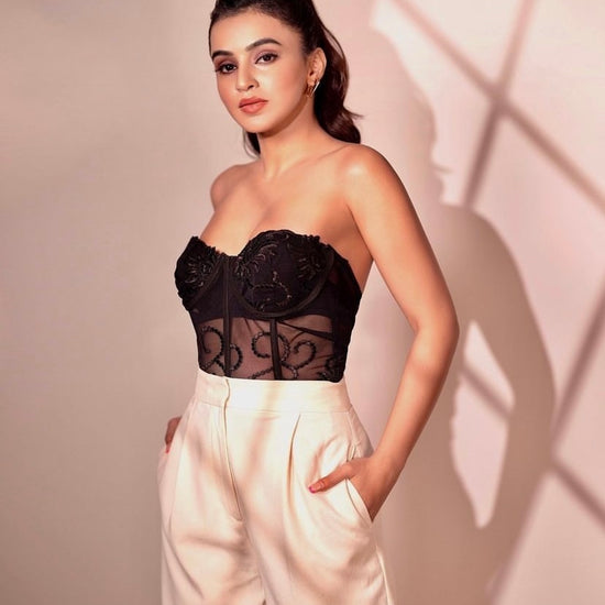 A stunning Cianna Lacey Corset Top worn by the gorgeous Ankita Sharma, this beautifully crafted corset is the perfect addition to your wardrobe for a chic and bold look. Designed with intricate lace details, this corset features boning for support and structure, and a drawstring closure for a perfect fit.