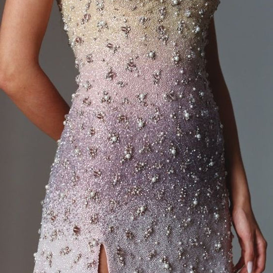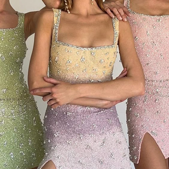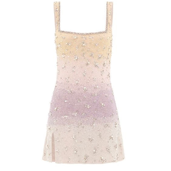 Step into the spotlight with this dazzling ombre mini dress, a show-stopping blend of artistry and glamour. Designed with a flattering square neckline and slender straps, the dress features a gradient color transition — from soft pastels to vivid brights — adorned with hand-applied crystals and shimmering beadwork throughout. The figure-hugging silhouette is complemented by a subtle thigh slit, adding movement and allure. Perfect for cocktail nights, special events, or any occasion where you want to sparkle from every angle.