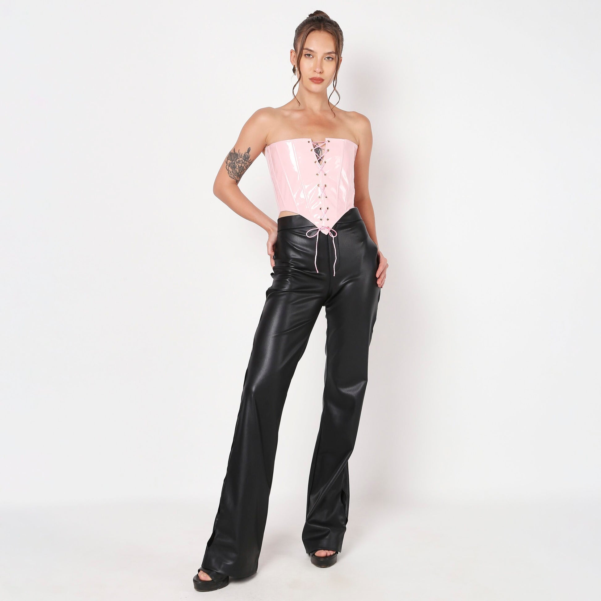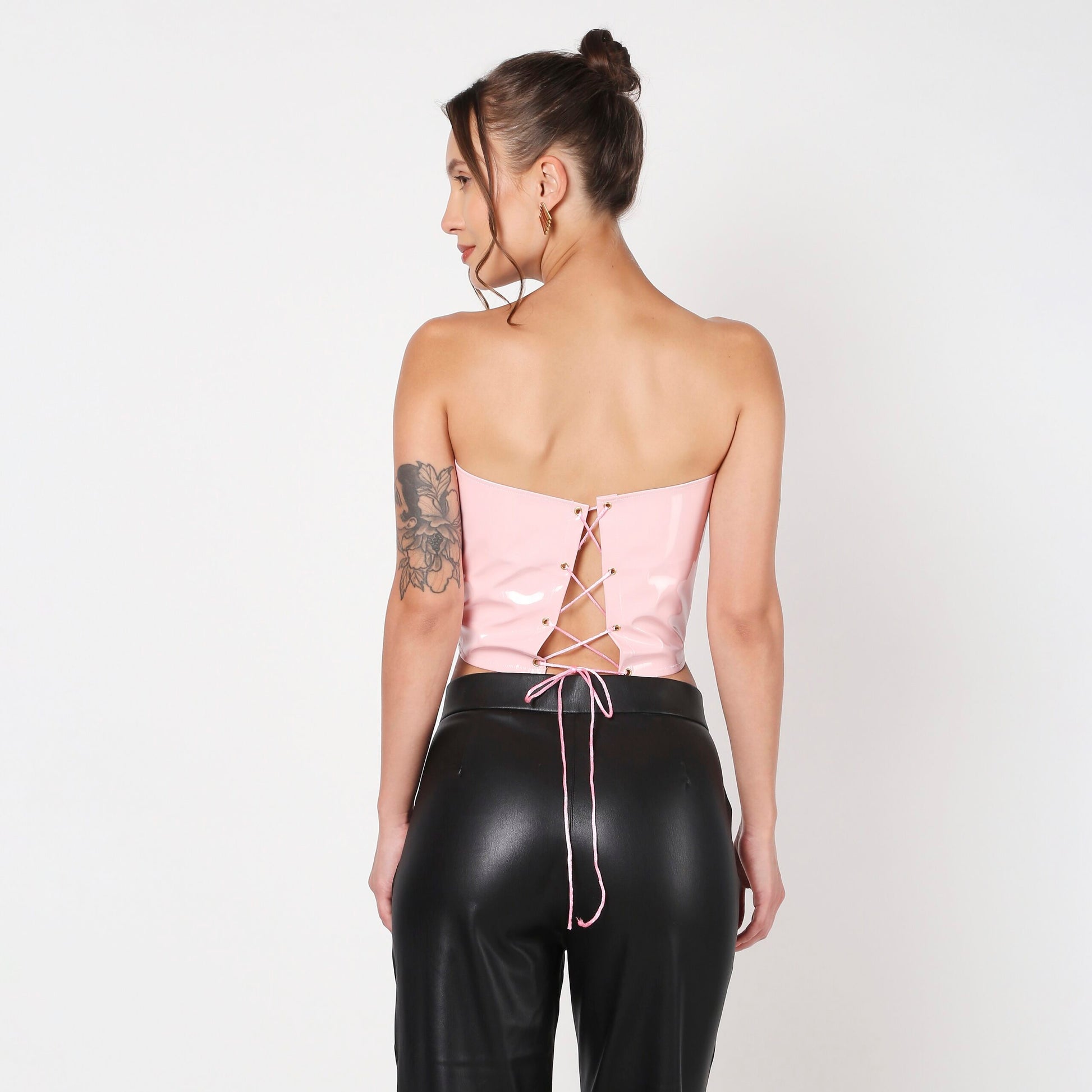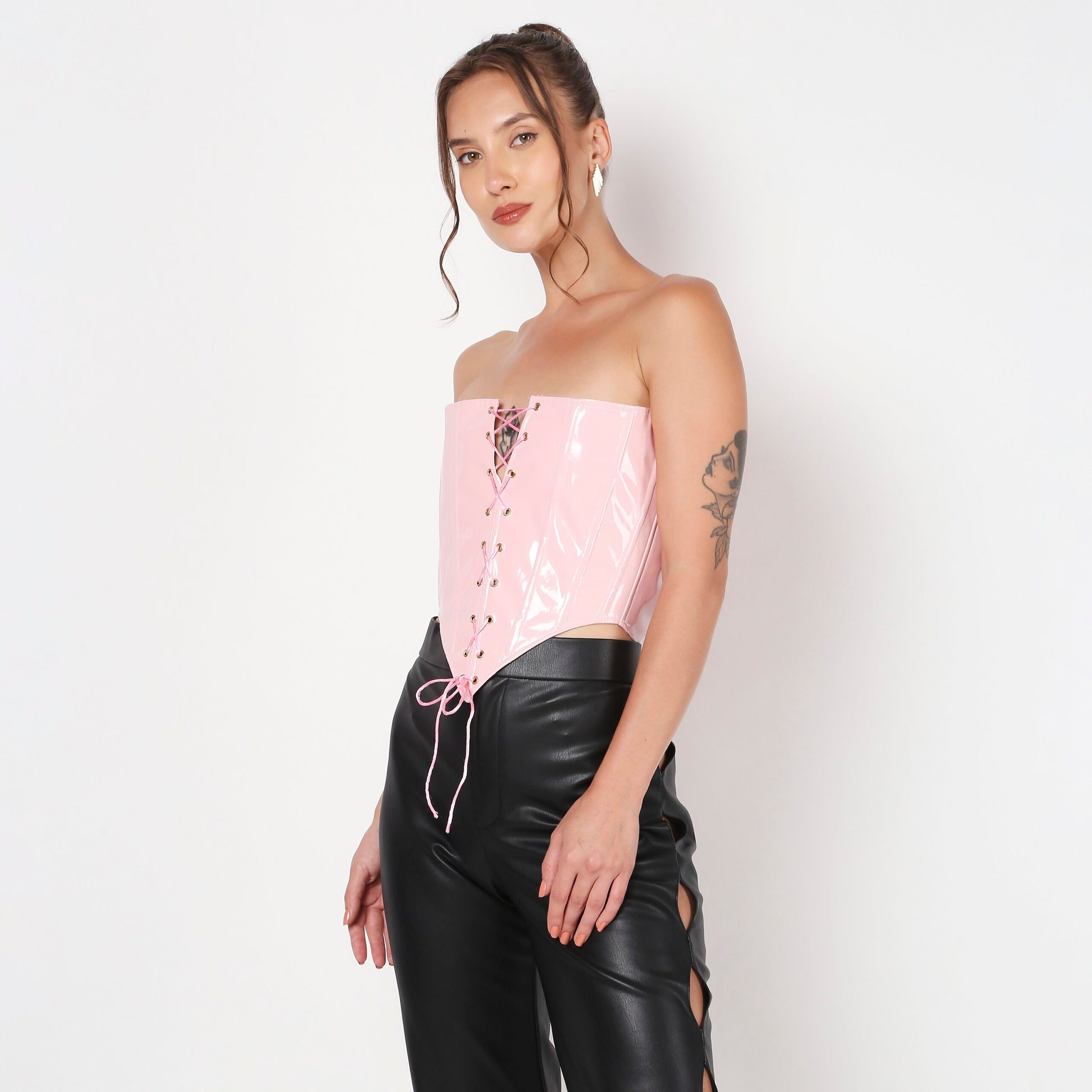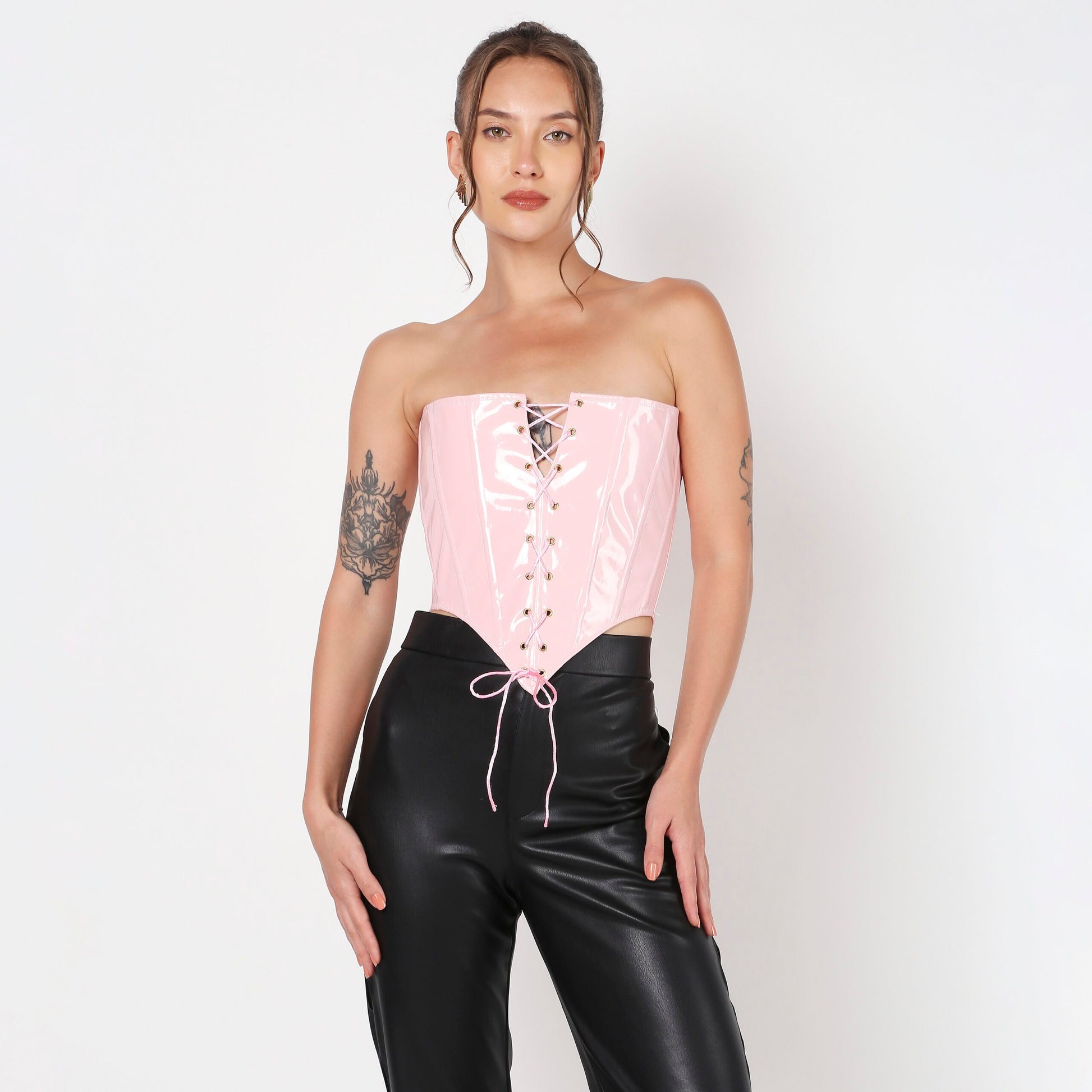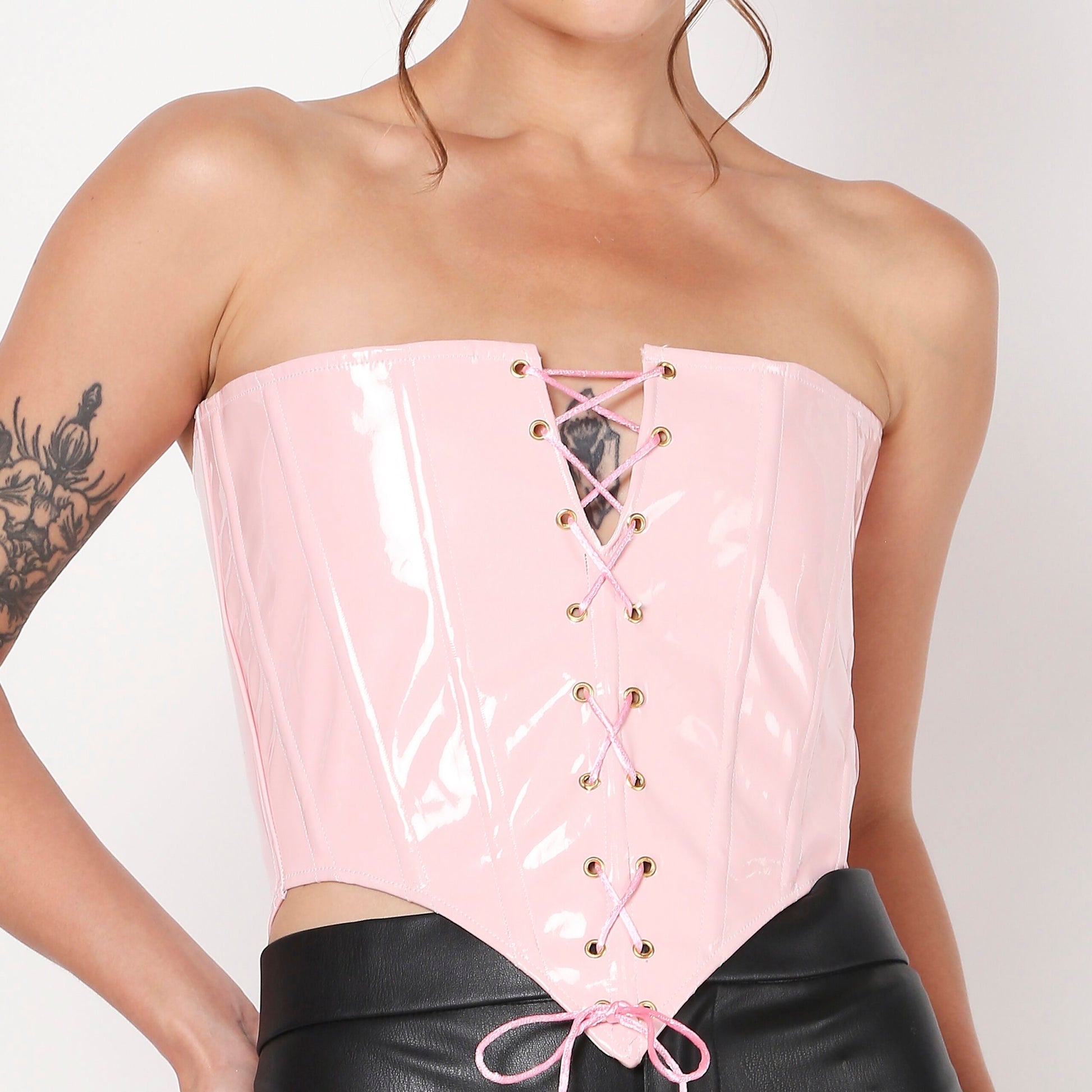 Add a touch of sweetness to your wardrobe with The Cotton Candy Corset Top. This beautiful pink faux leather corset top features a stylish criss-cross design on the front, offering a flattering and bold look. Perfect for making a statement at any occasion, this corset top combines edgy style with feminine charm.