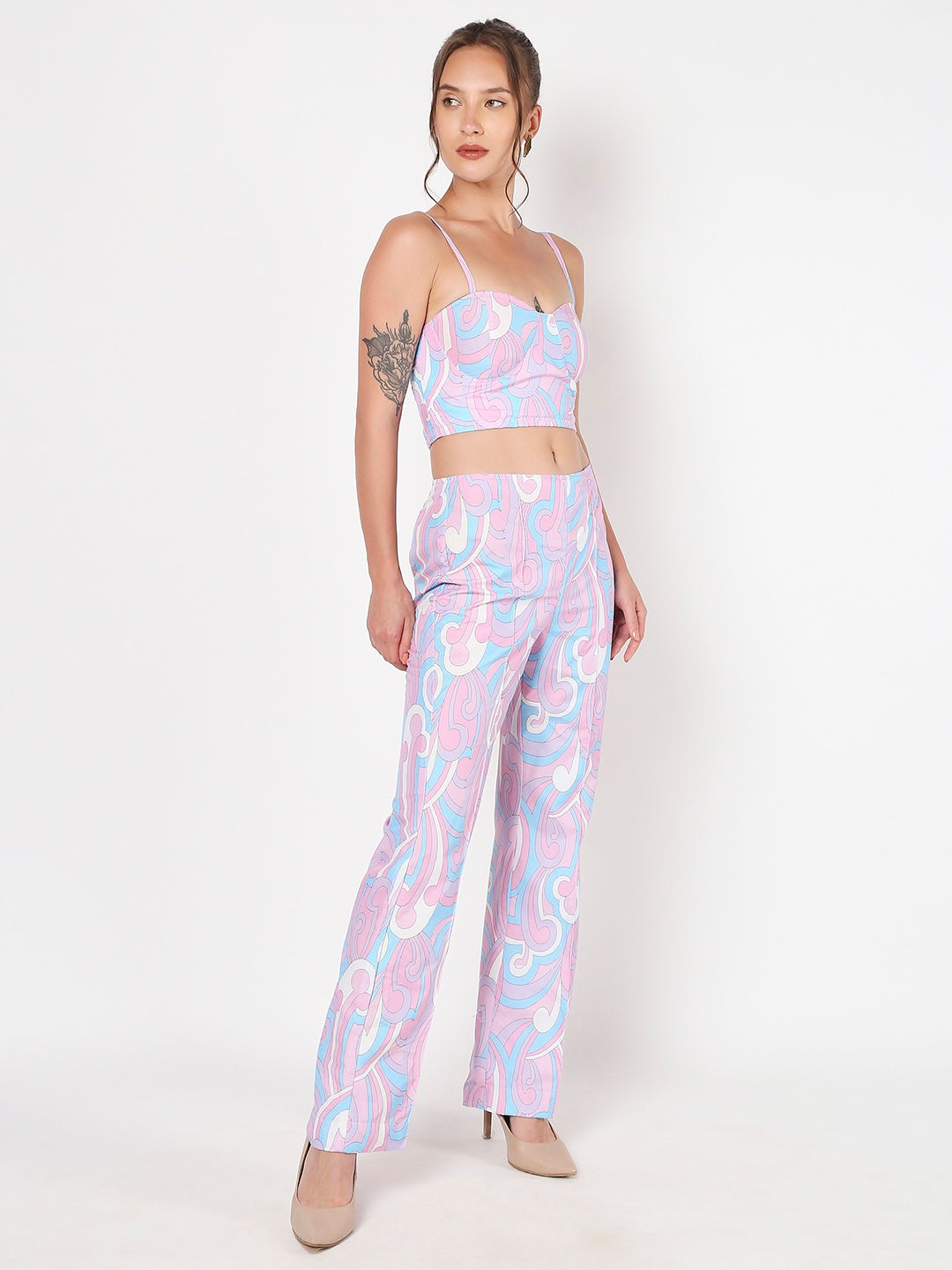 Multi Color printed co-ord set. Model is wearing xs size Wash Care:-Hand wash separately with mild detergent Do not Bleach Do not tumble dry Line dry in the shade