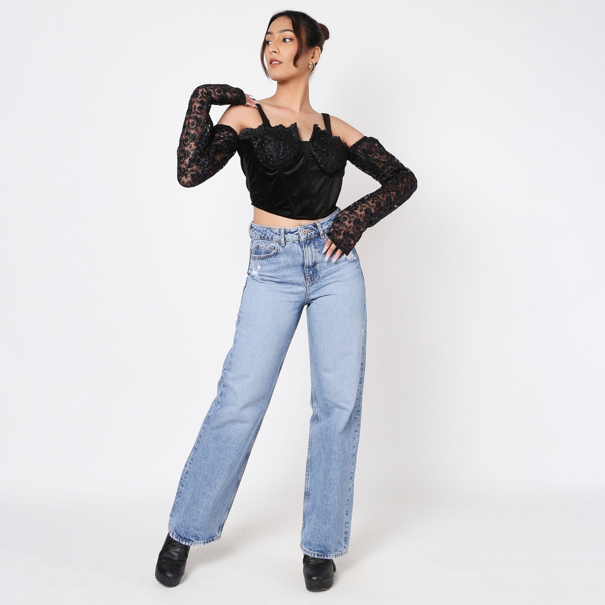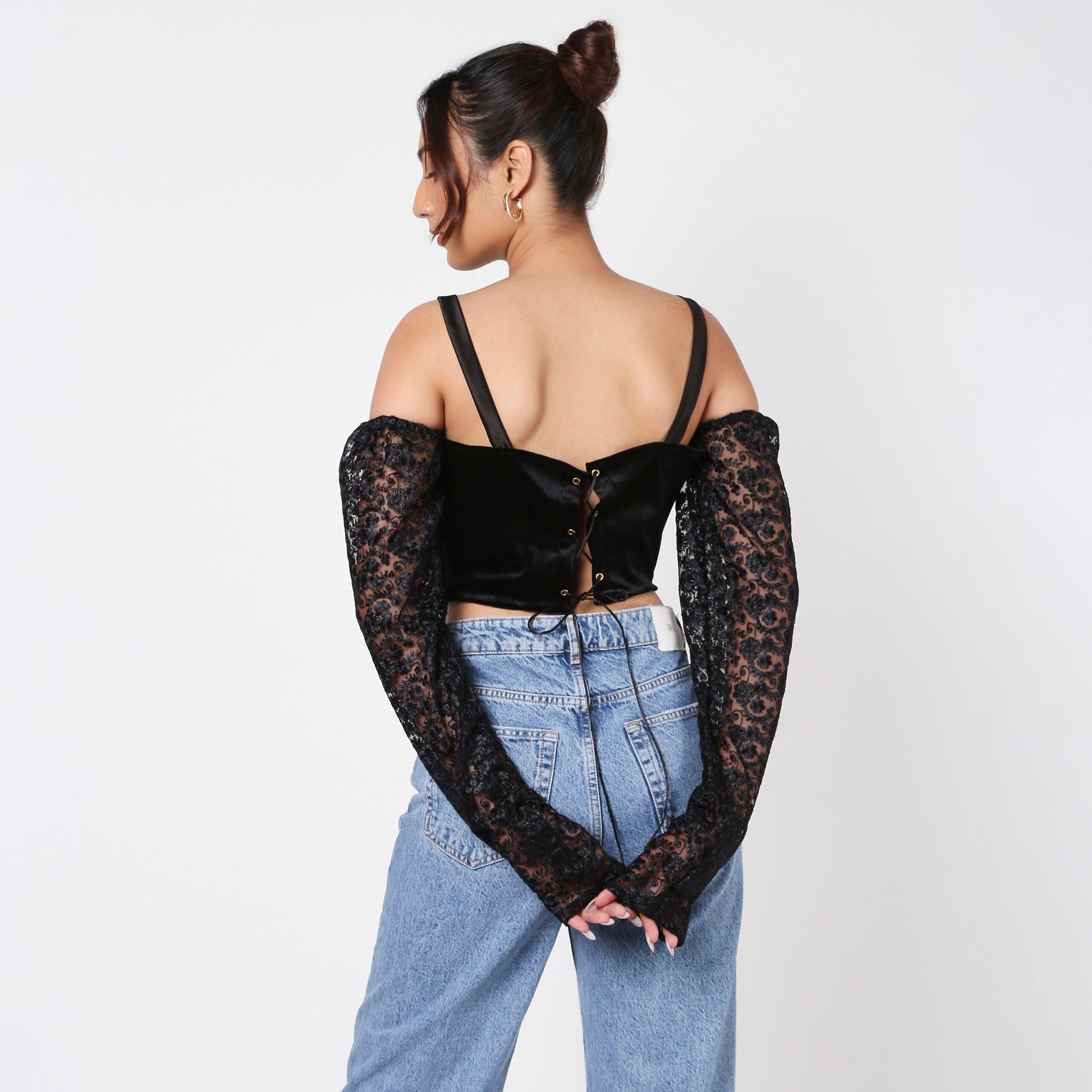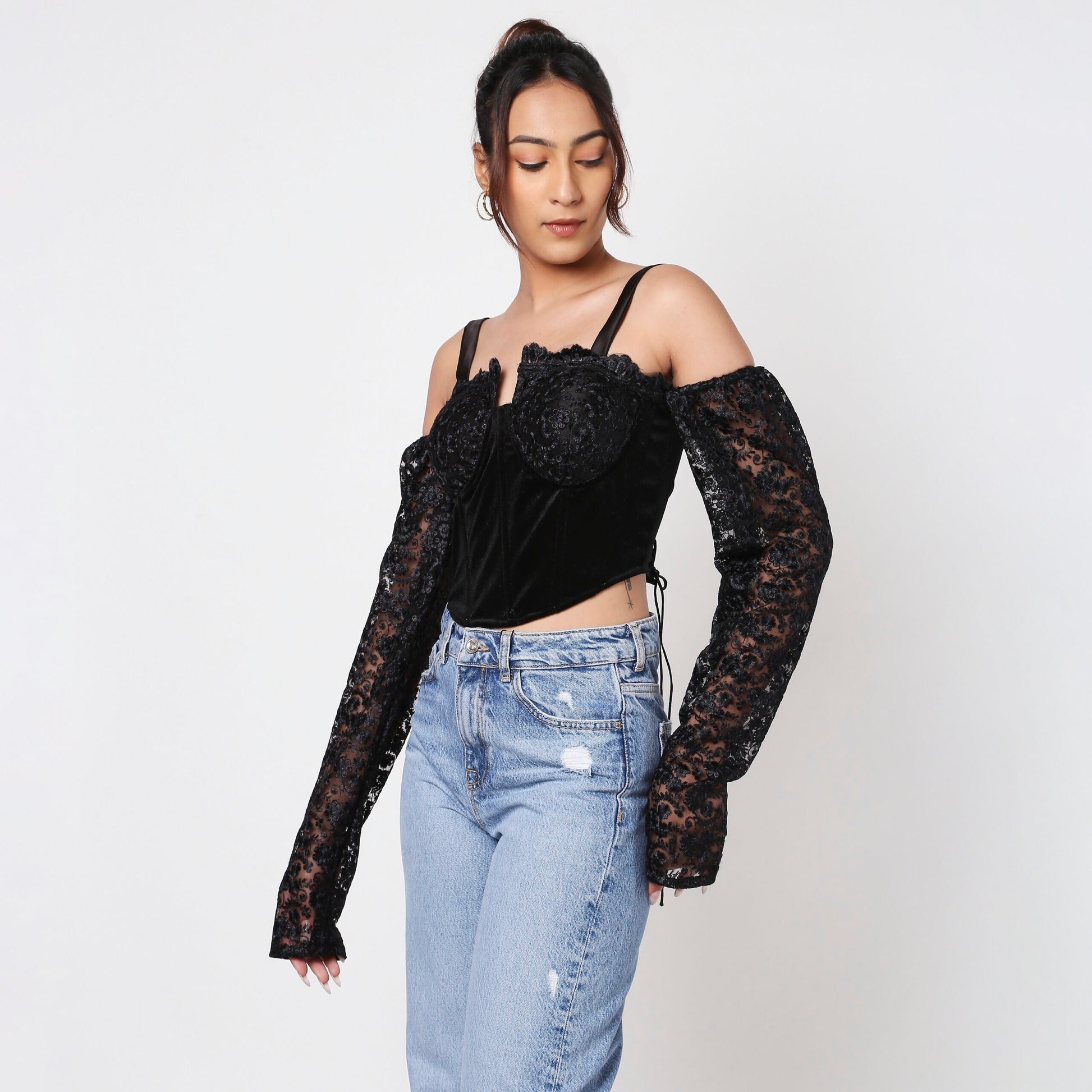 Elevate your style with the Full Sleeves Velvet Lacey Corset Top, a stunning fusion of luxurious velvet and intricate lace detailing. This corset top features elegant full sleeves and is designed to offer both structure and comfort. The combination of soft velvet and delicate lace makes this top a perfect choice for a refined, chic look.