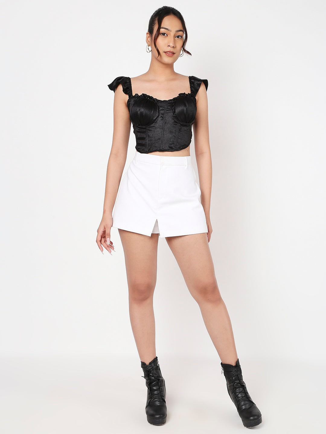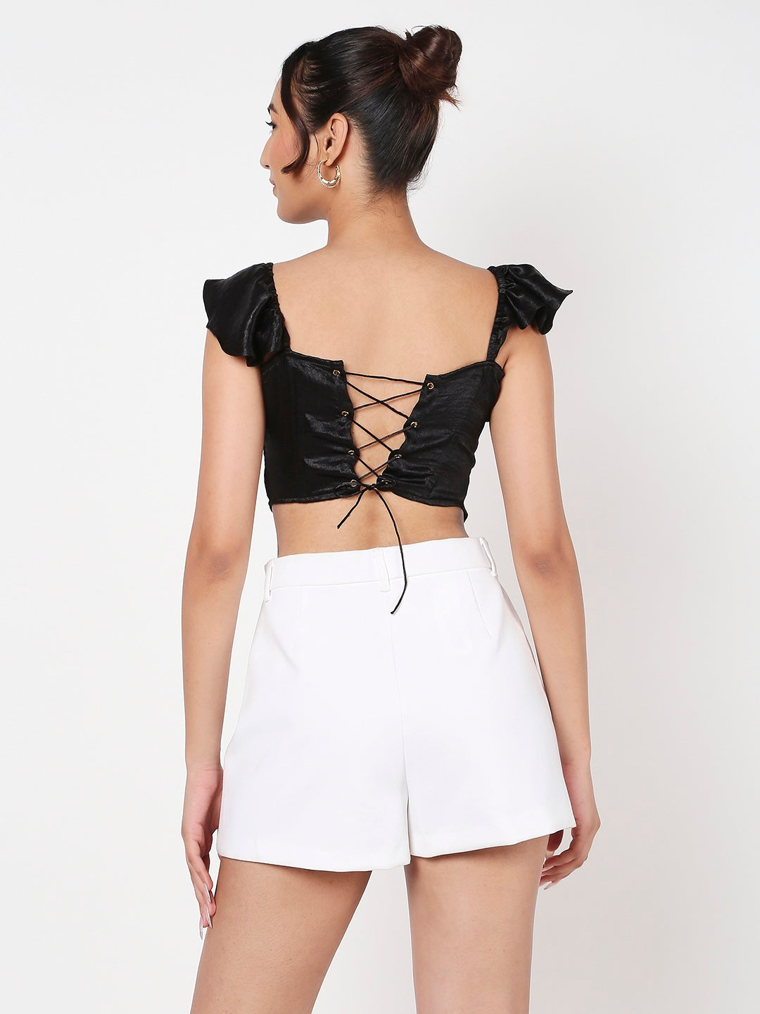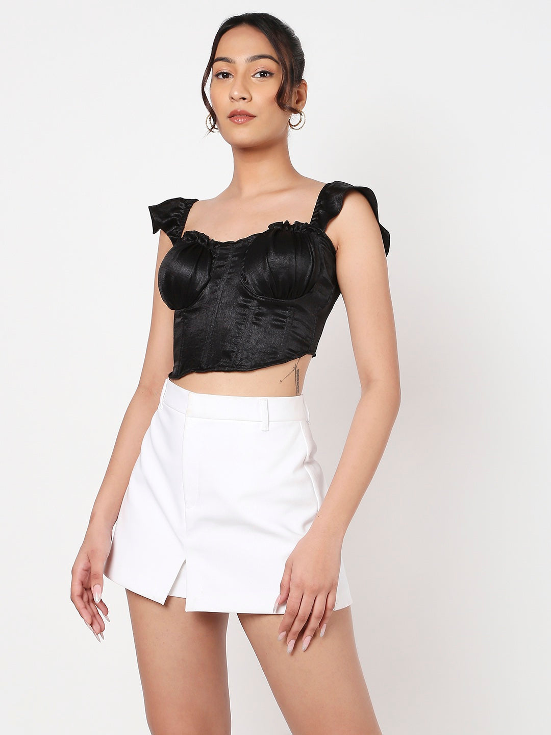 The Gabriel Corset Top combines timeless elegance and modern flair with its stunning black satin fabric and ruffled sleeves. Featuring padding and boning for support and structure, this corset top is designed with a stylish crisscross back for a flattering fit. Perfect for making a bold fashion statement, the Gabriel Corset Top is the ideal addition to any wardrobe.