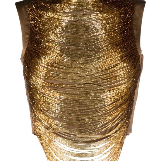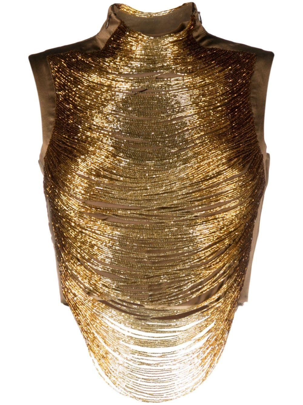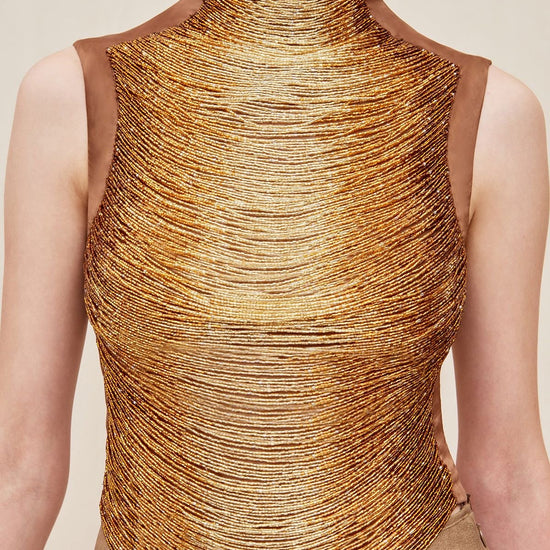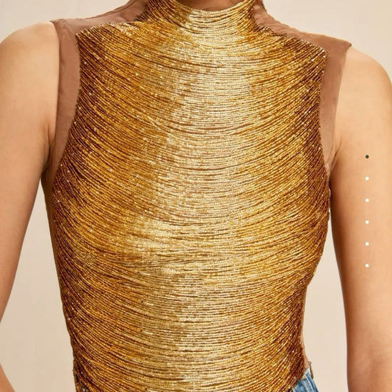 A structured sleeveless high-neck top featuring fine metallic beadwork laid in horizontal ripples. The gold-toned beads create a shimmering armor-like finish, blending modern glam with vintage craftsmanship.