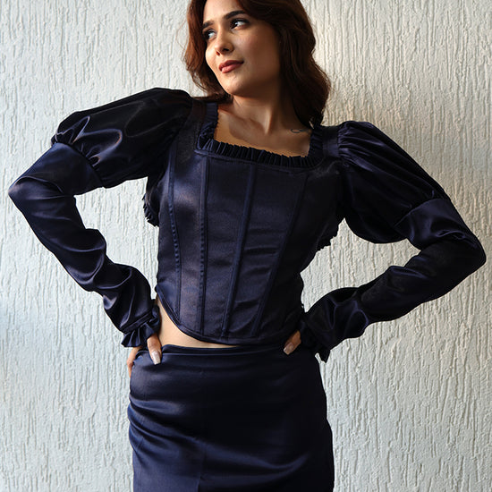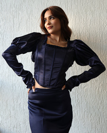 Karia Navy Blue Puff Sleeve Corset & Satin Skirt