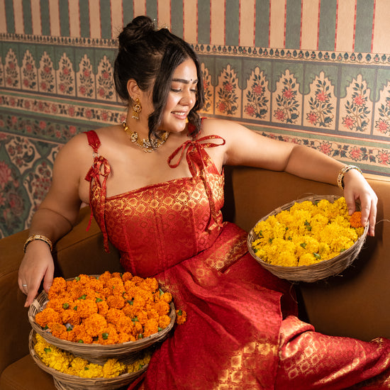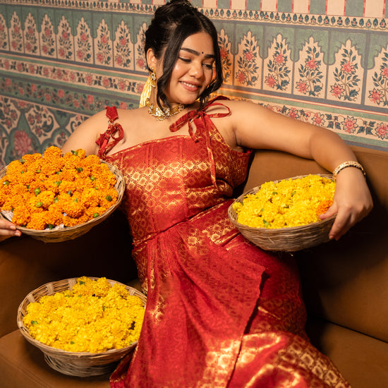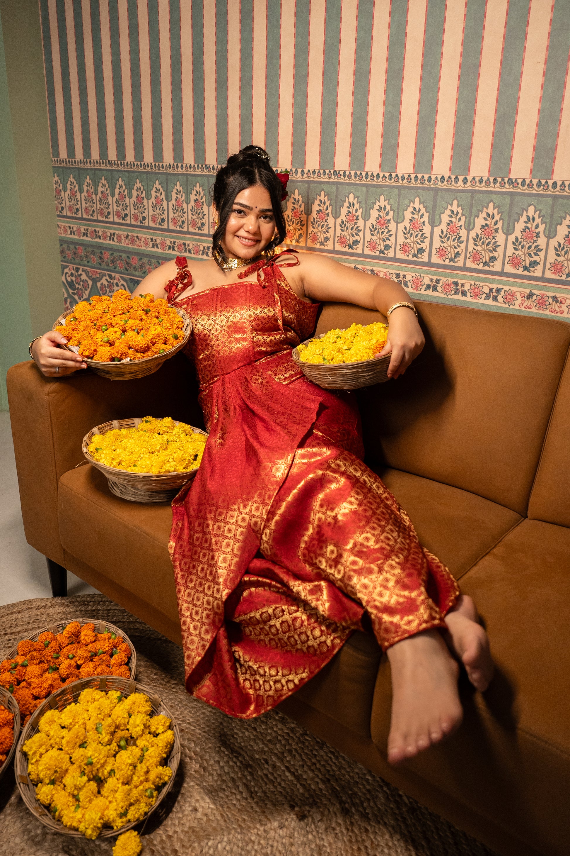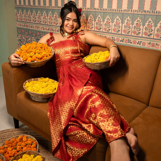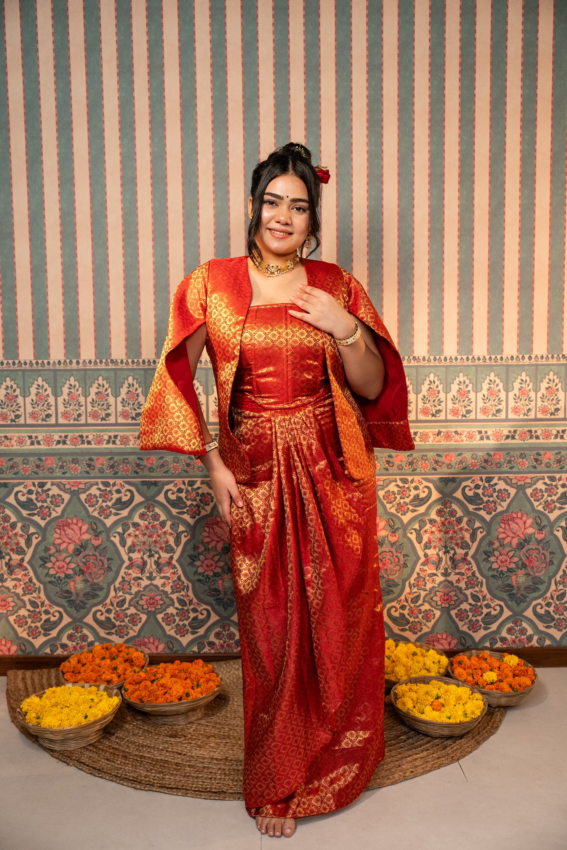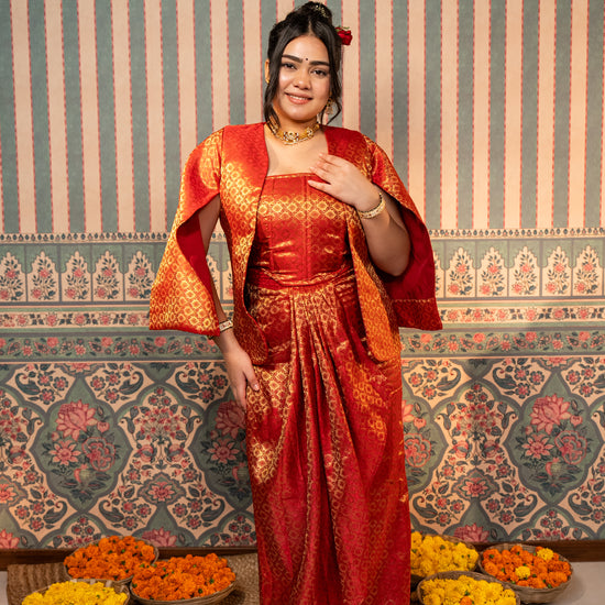 Unleash a blend of tradition and contemporary elegance with our Dhoti Corset and Jacket Set, crafted from luxurious brocade fabric. This striking ensemble features a tailored corset paired with a structured jacket, beautifully balanced with a flowy dhoti-style bottom. The rich brocade material adds an opulent touch, creating a look that’s both timeless and trendsetting.