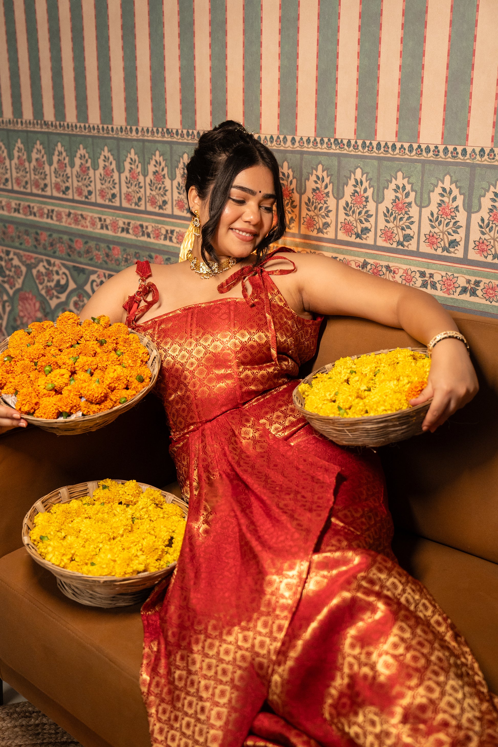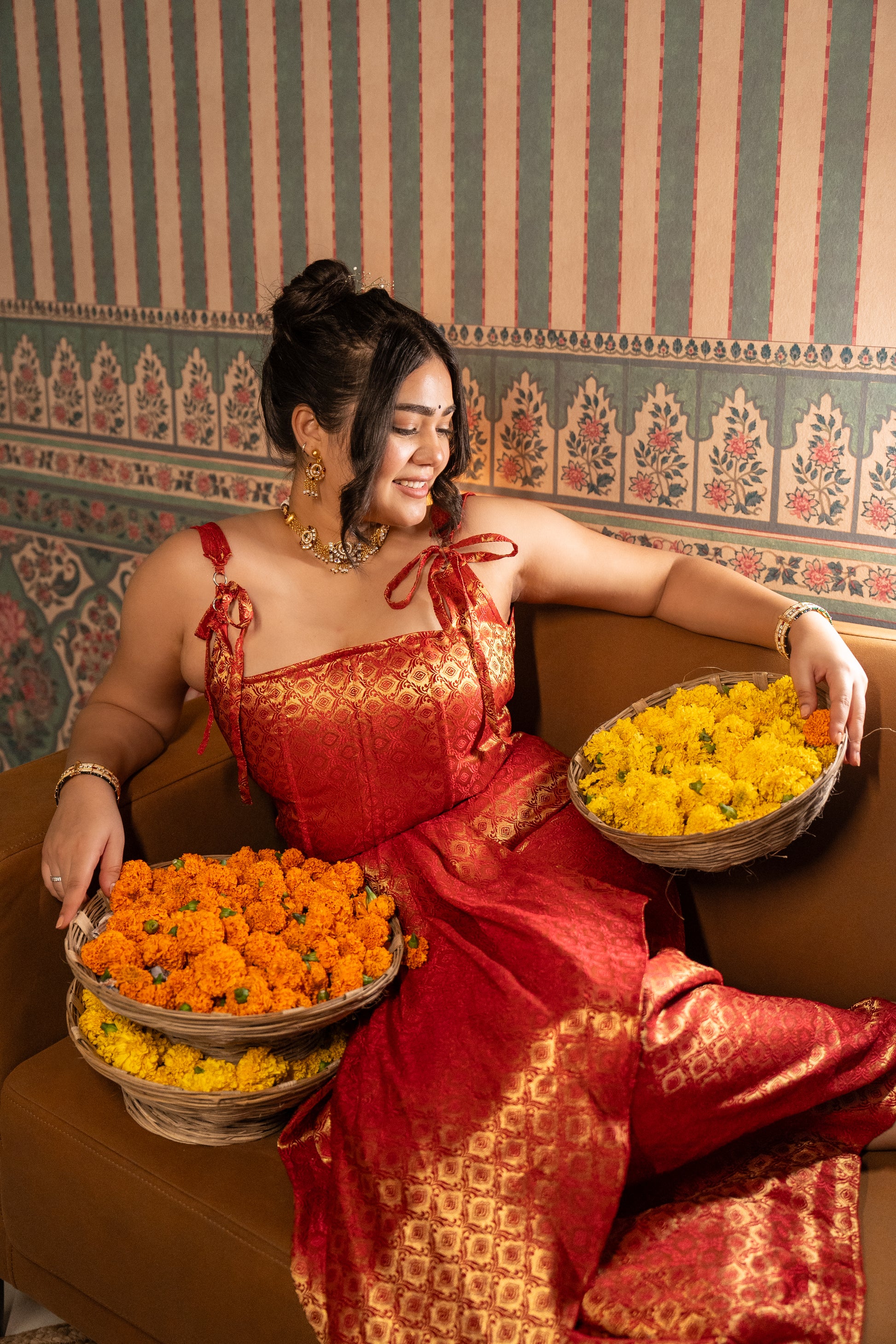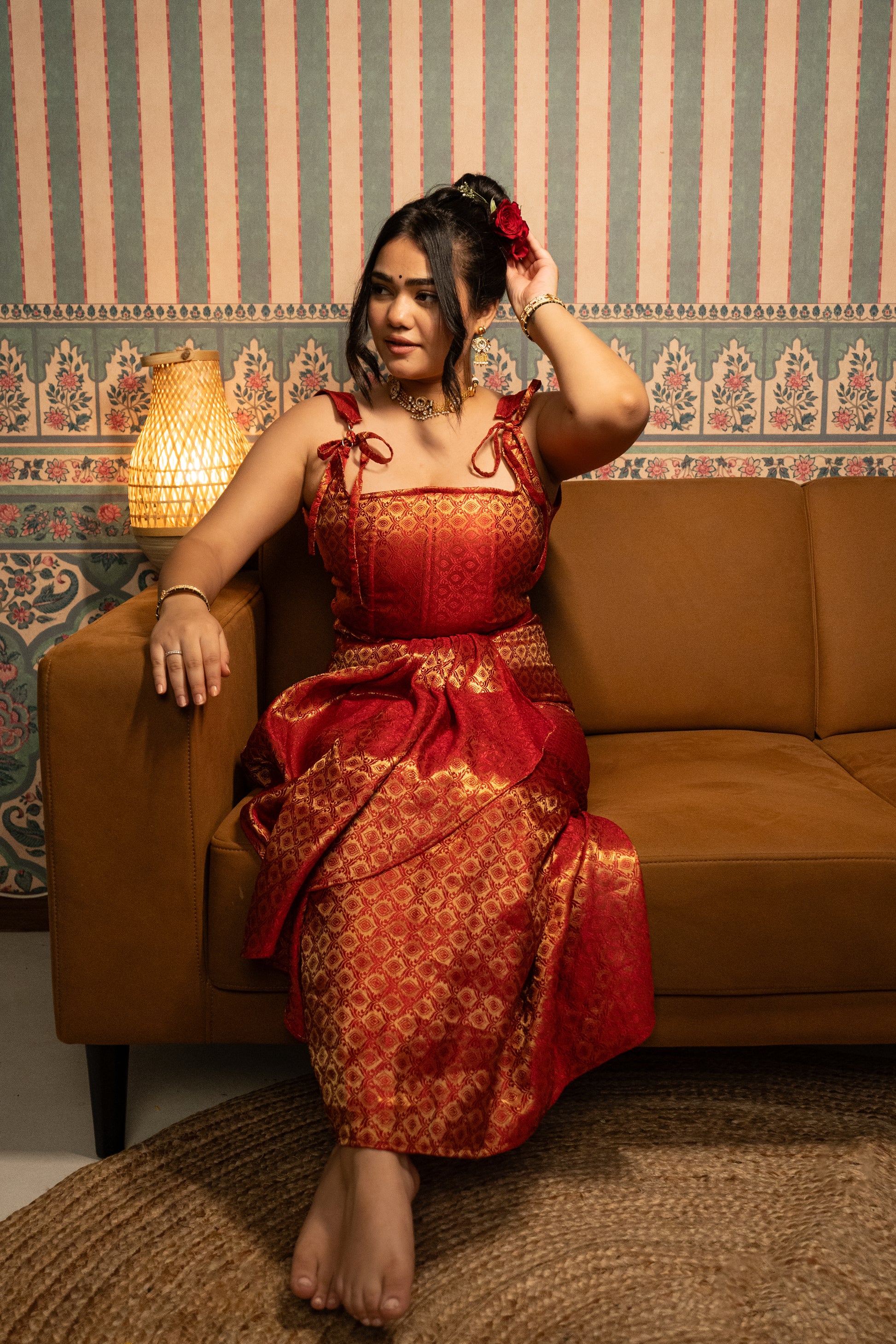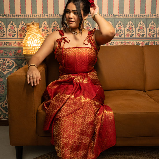 Unleash a blend of tradition and contemporary elegance with our Dhoti Corset and Jacket Set, crafted from luxurious brocade fabric. This striking ensemble features a tailored corset paired with a structured jacket, beautifully balanced with a flowy dhoti-style bottom. The rich brocade material adds an opulent touch, creating a look that’s both timeless and trendsetting.