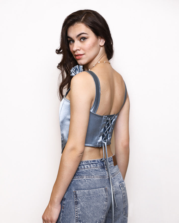 Scuba mix satin The Kitty blue corset top combines heavy boning on the bust ,and shoulder Straps