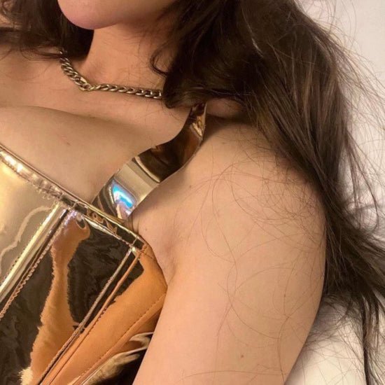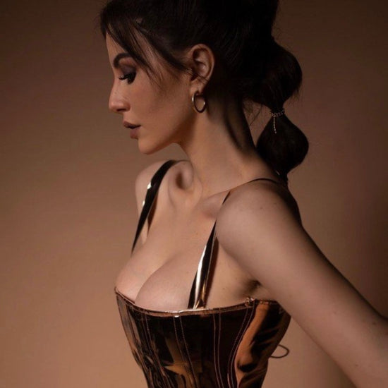 The Vinyl Faux Leather Corset Top in a stunning shiny gold color is the perfect statement piece for any wardrobe. Designed with structured boning for a flattering fit, this corset top combines bold style with a sleek, modern edge. Its glossy finish and tailored design ensure you stand out effortlessly.