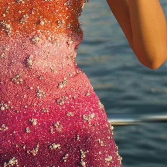 - Details: Fully embellished with crystals, beads, and sequins in an ombre gradient.