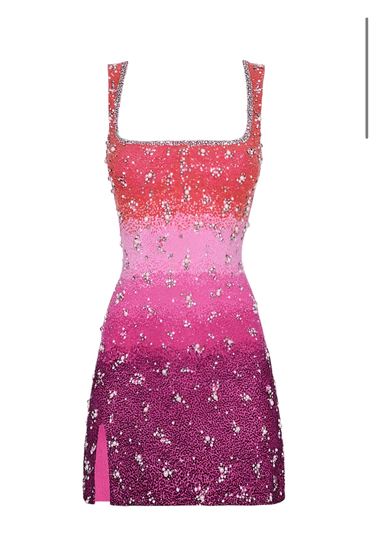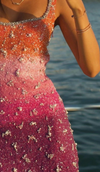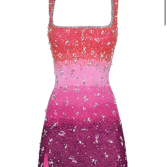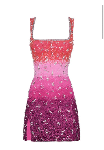 Step into the spotlight with this dazzling ombre mini dress, a show-stopping blend of artistry and glamour. Designed with a flattering square neckline and slender straps, the dress features a gradient color transition — from soft pastels to vivid brights — adorned with hand-applied crystals and shimmering beadwork throughout. The figure-hugging silhouette is complemented by a subtle thigh slit, adding movement and allure. Perfect for cocktail nights, special events, or any occasion where you want to sparkle from every angle.