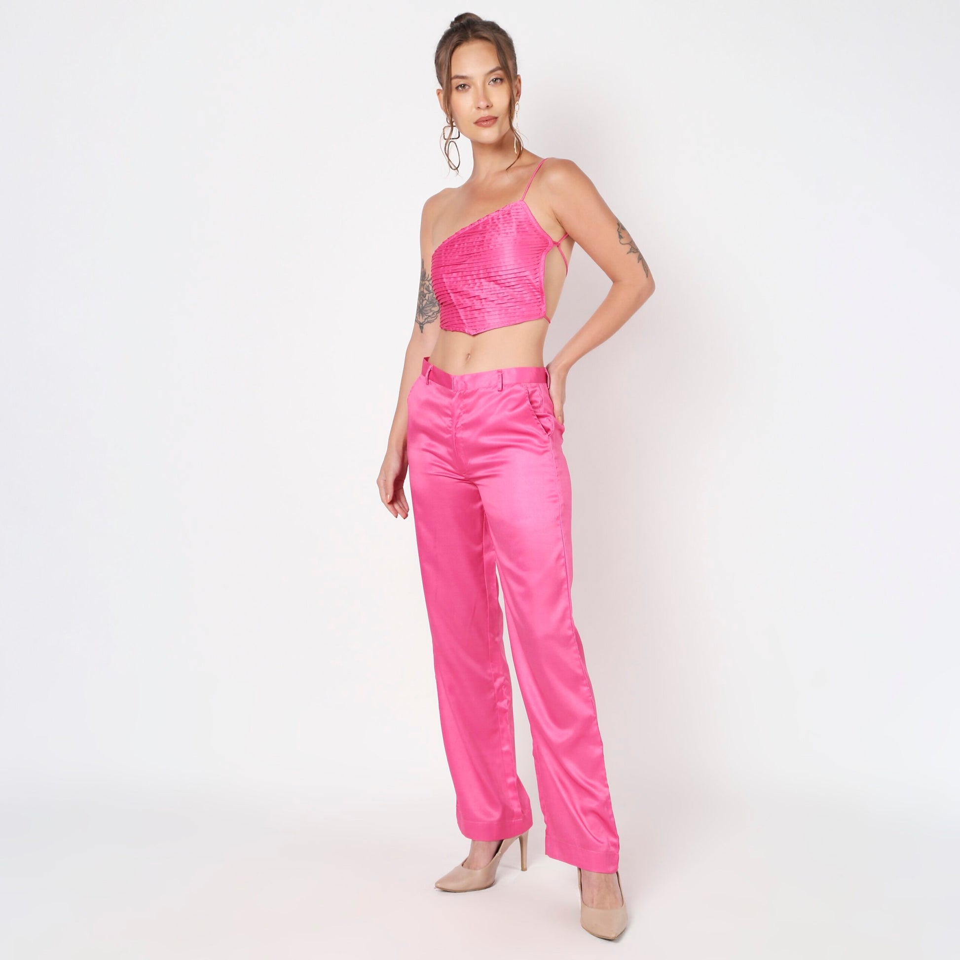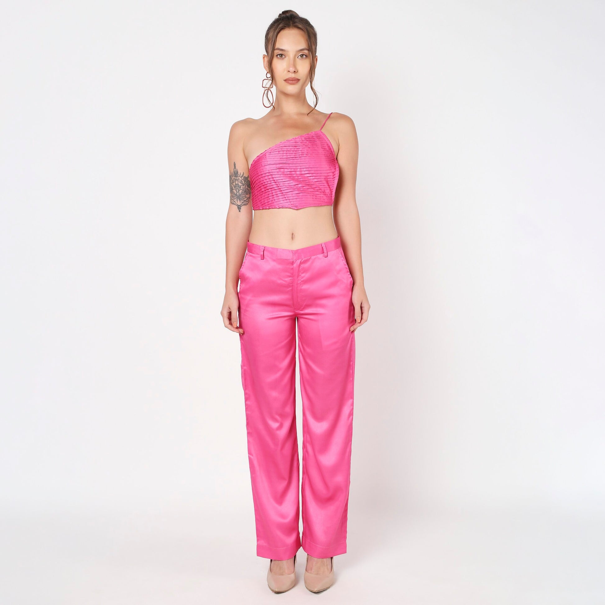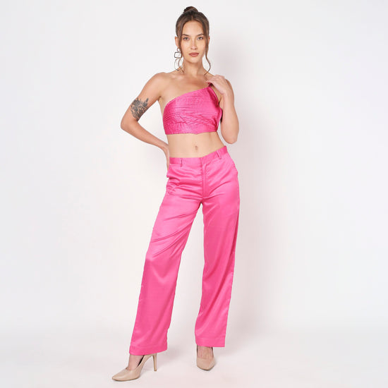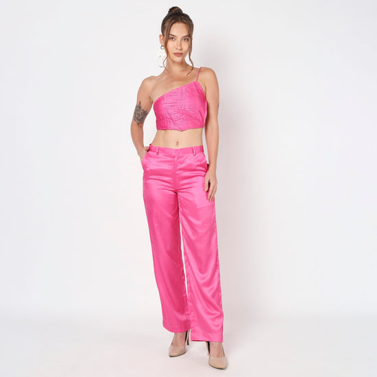 Elevate your style with the Pink Pleated Co-Ord Set, a chic ensemble crafted from luxurious satin fabric. Featuring a beautifully pleated design, this set is perfect for both casual and special occasions, combining elegance with ease.