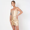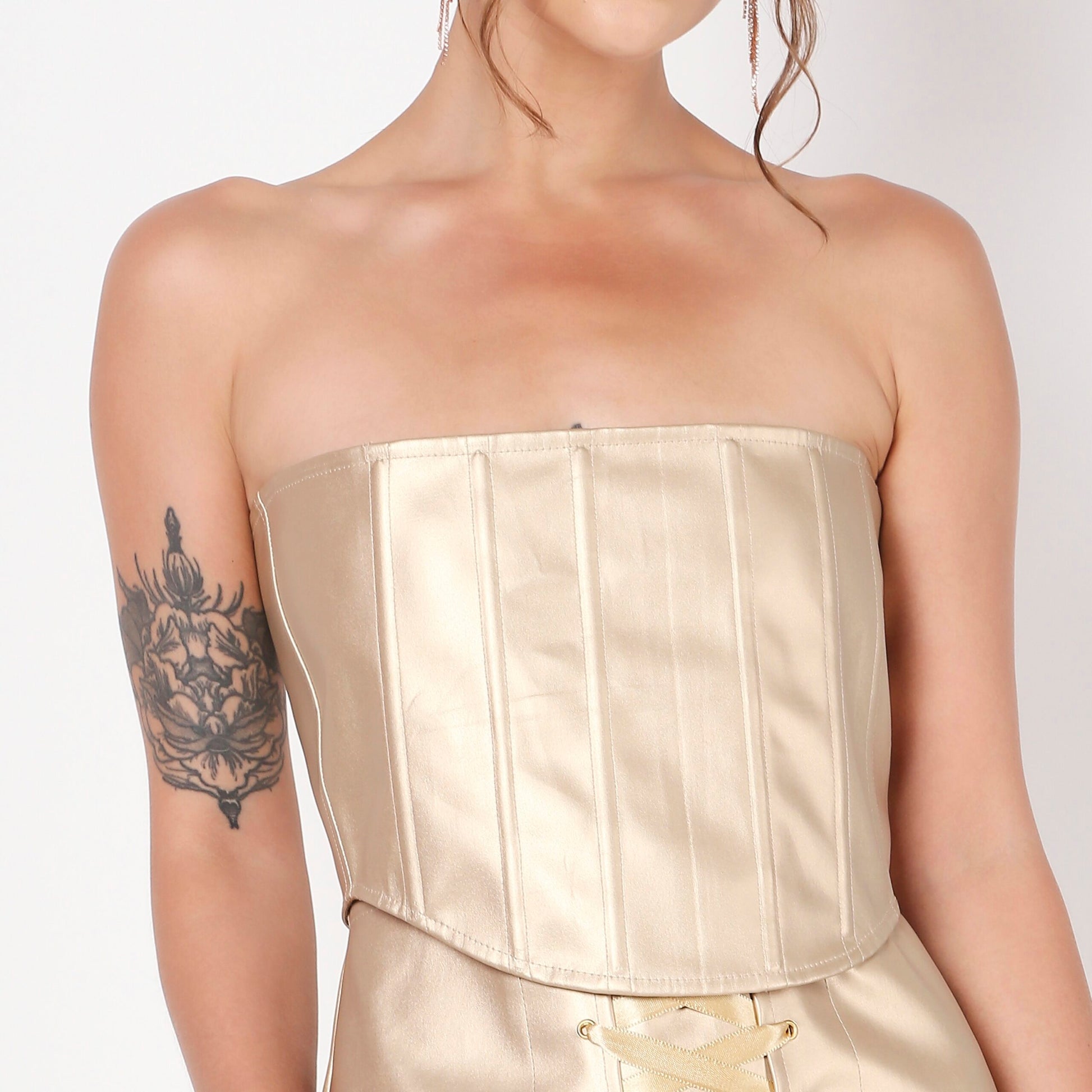 Introducing the Princess Leia Corset and Skirt, a captivating co-ord set crafted from luxurious golden leather. This elegant outfit combines a structured corset top with a matching skirt, designed to exude confidence and charm.
