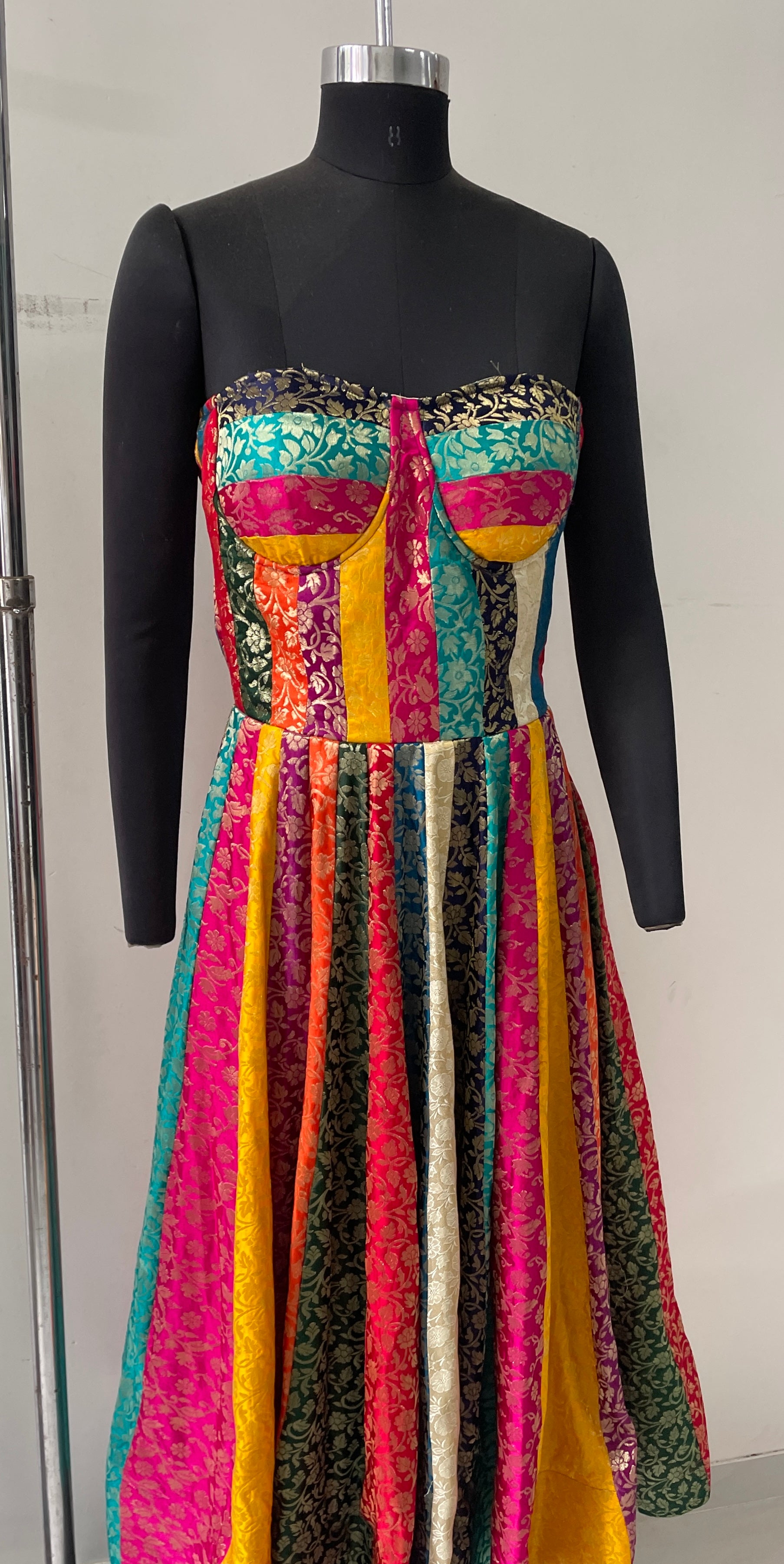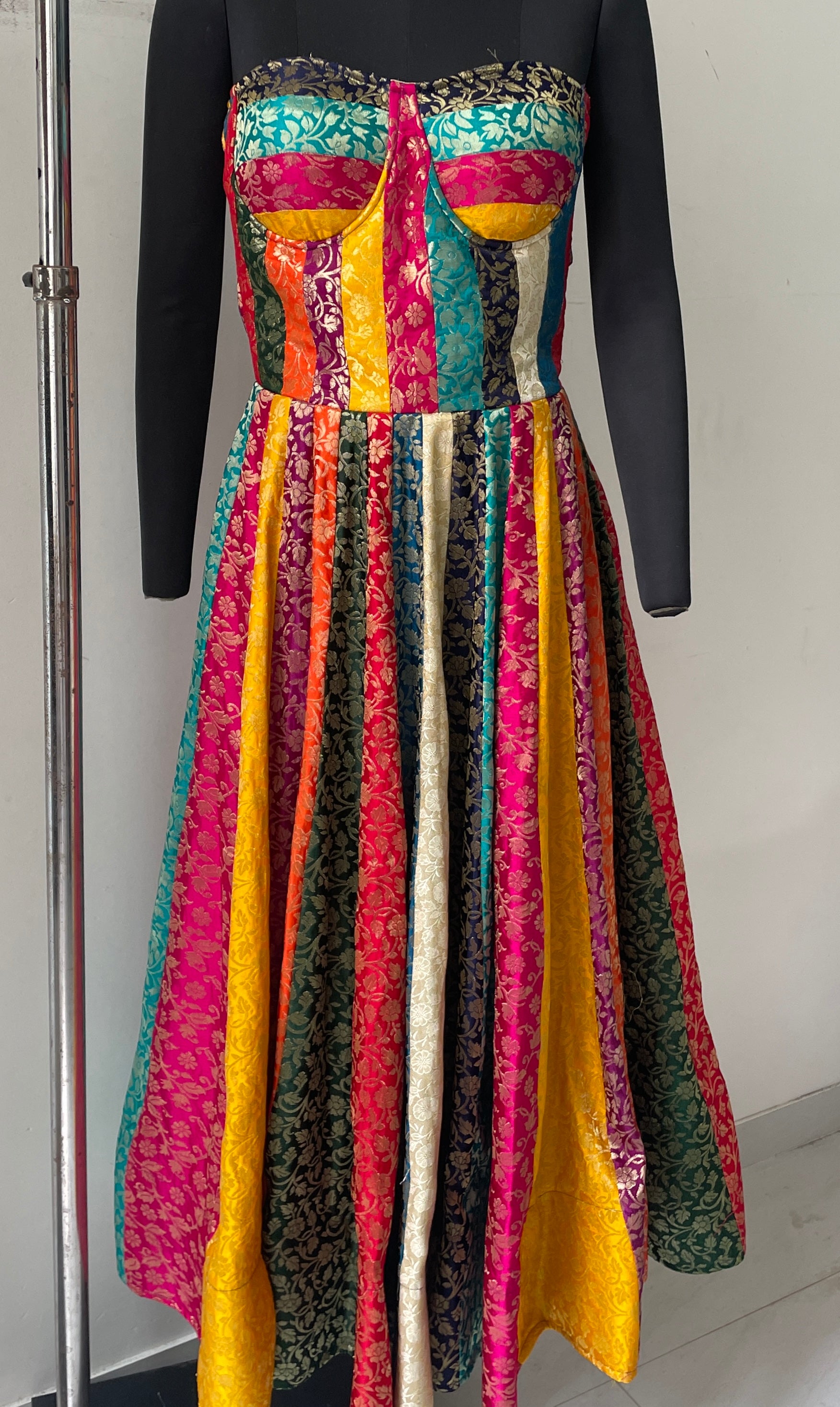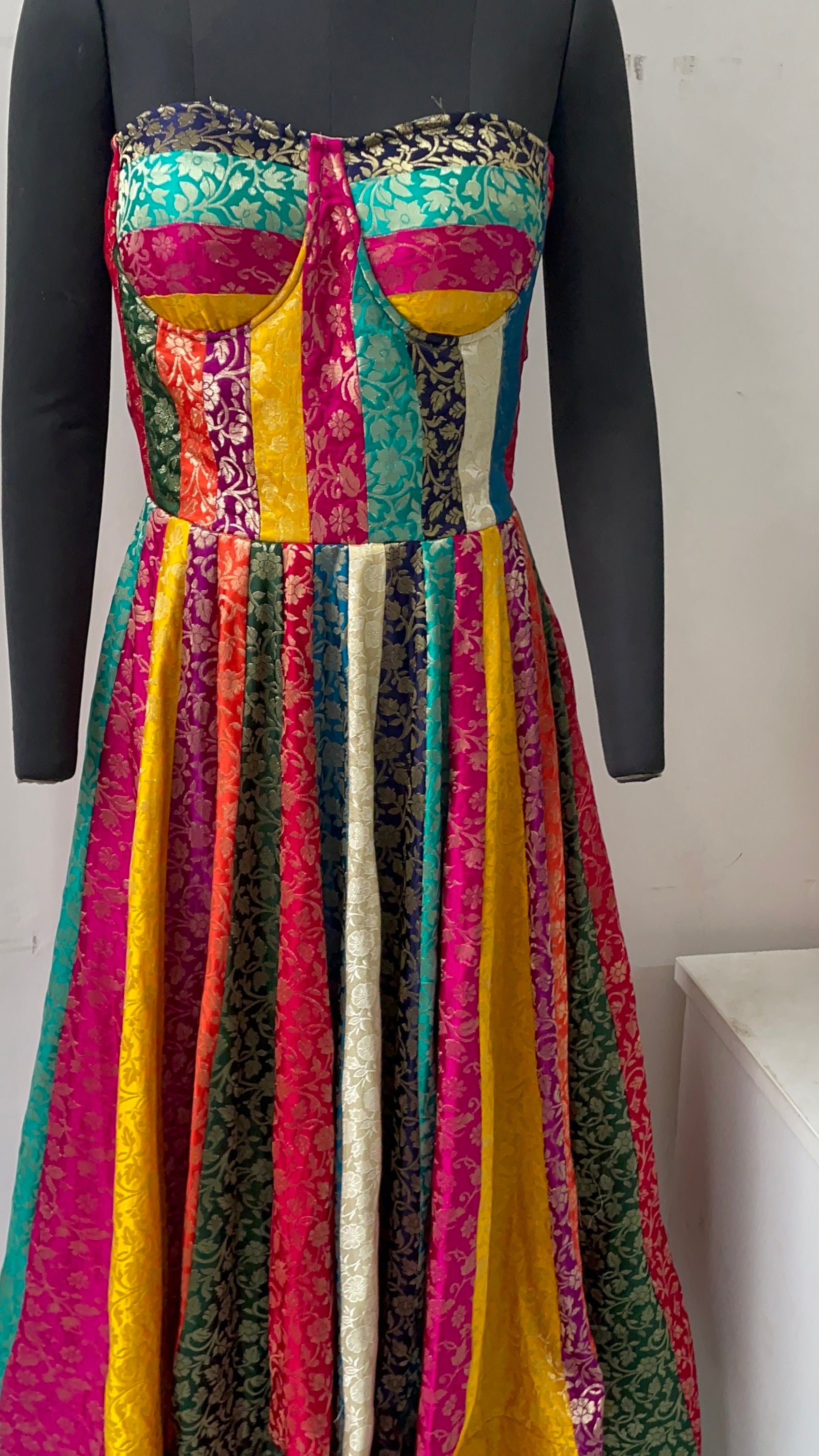 Ideal for weddings, festive events, or special occasions, this Rani Multicolor Brocade Corset Anarkali exudes grace and sophistication, making it a memorable addition to any wardrobe.