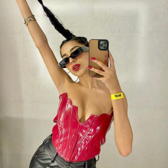 Our Red latex corset is made from leather material that'll make you feel your most glamorous as soon as you slip it on. It has a décolletage baring strapless bodice and the sculptural boning defines your waist. The pretty lace up back allows you to control the fit and we love this paired with jeans or skirt for a more glam vibe.
