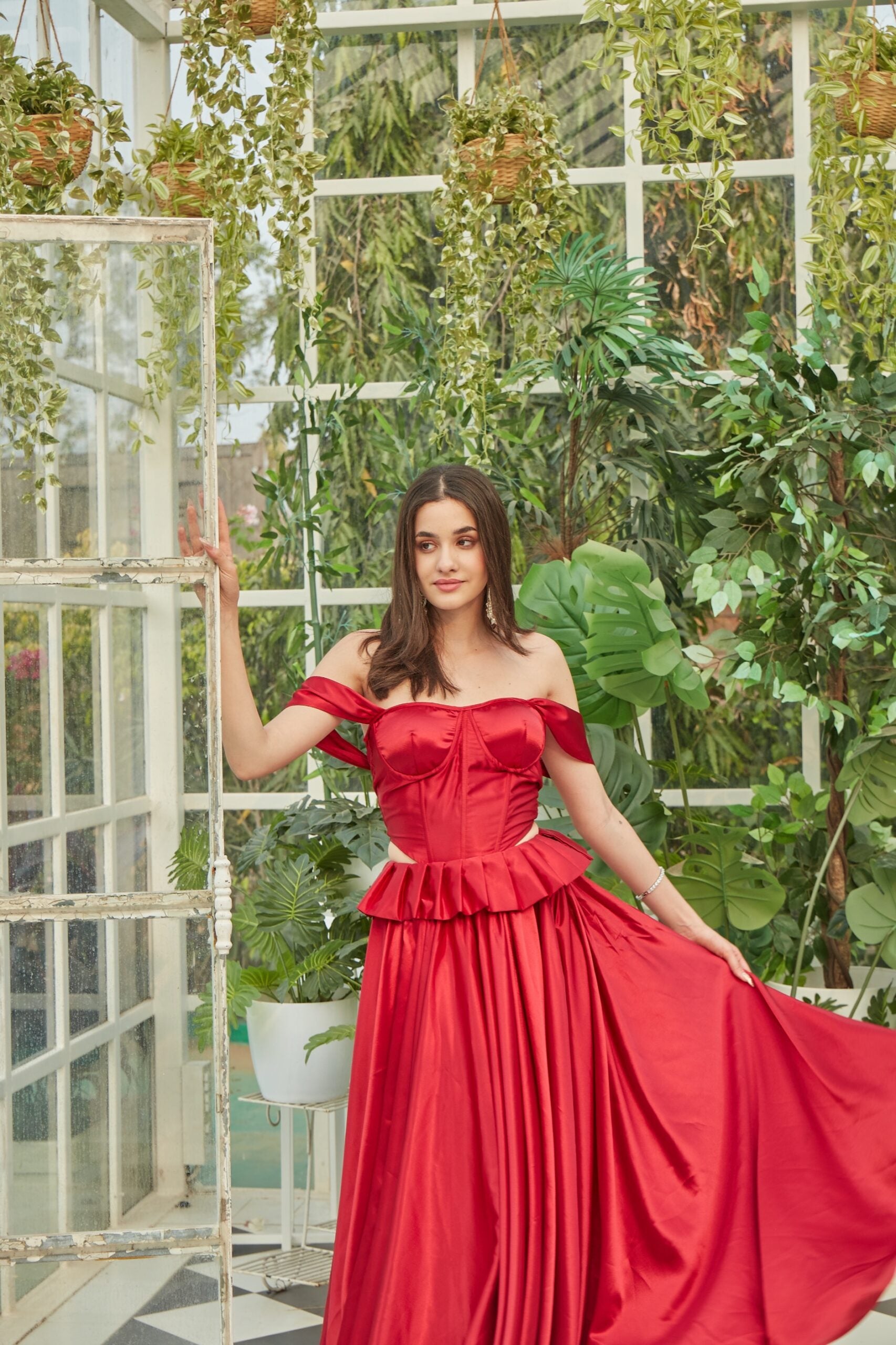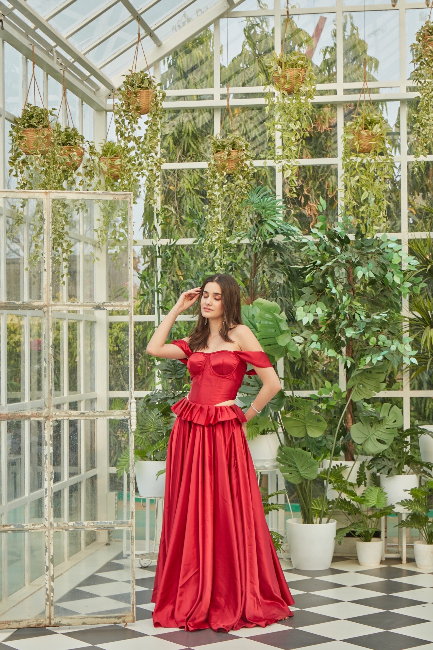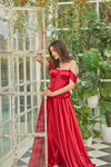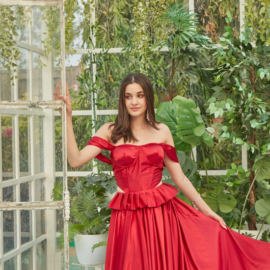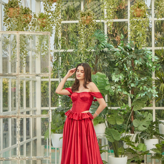 Red satin lehenga and corset top