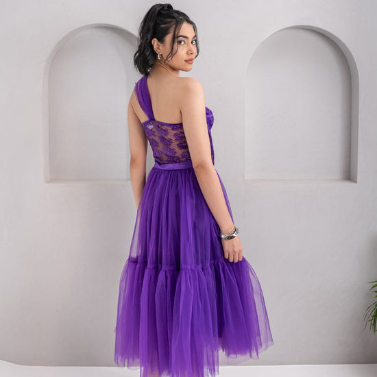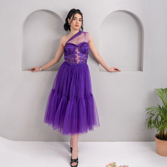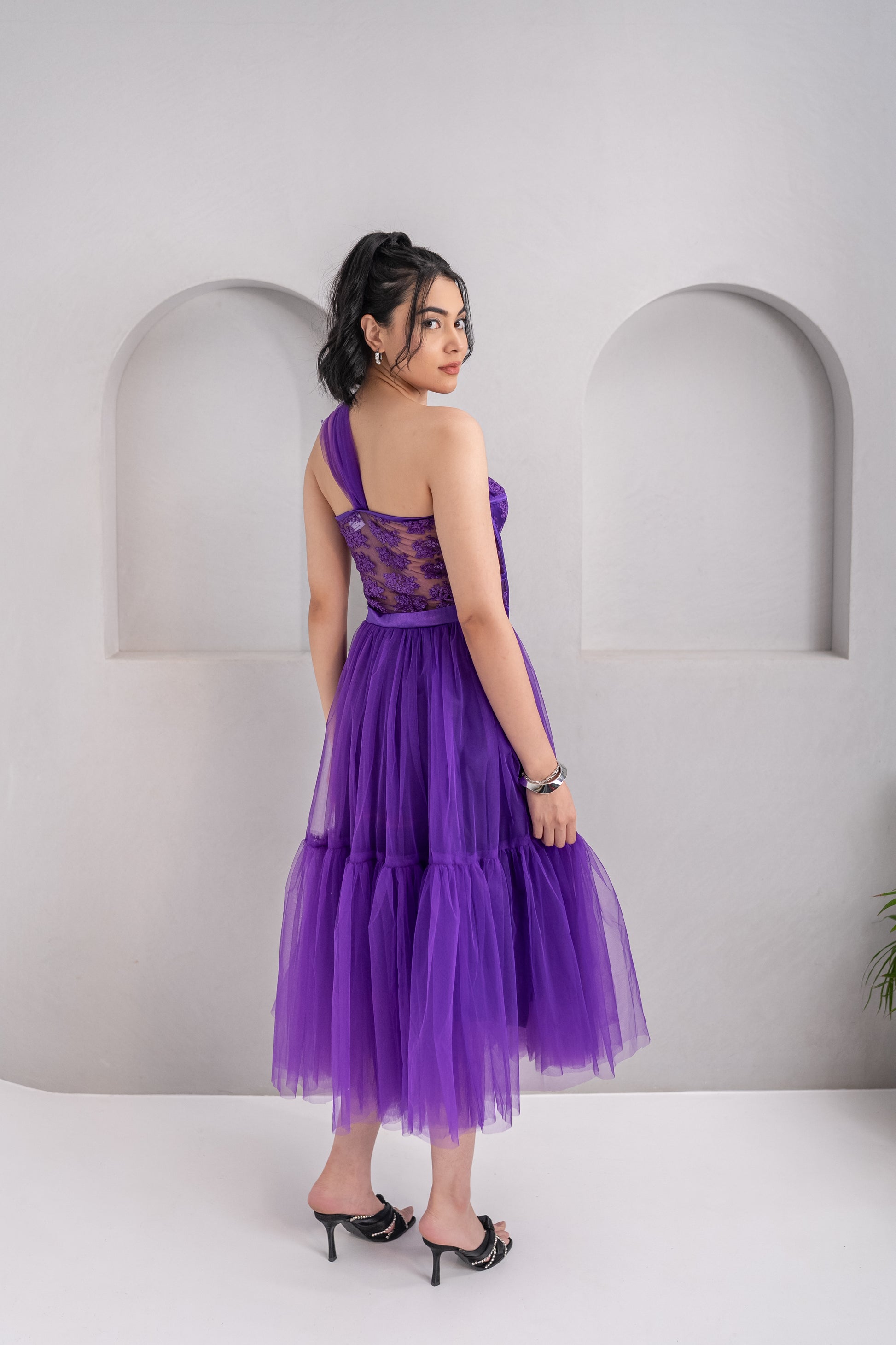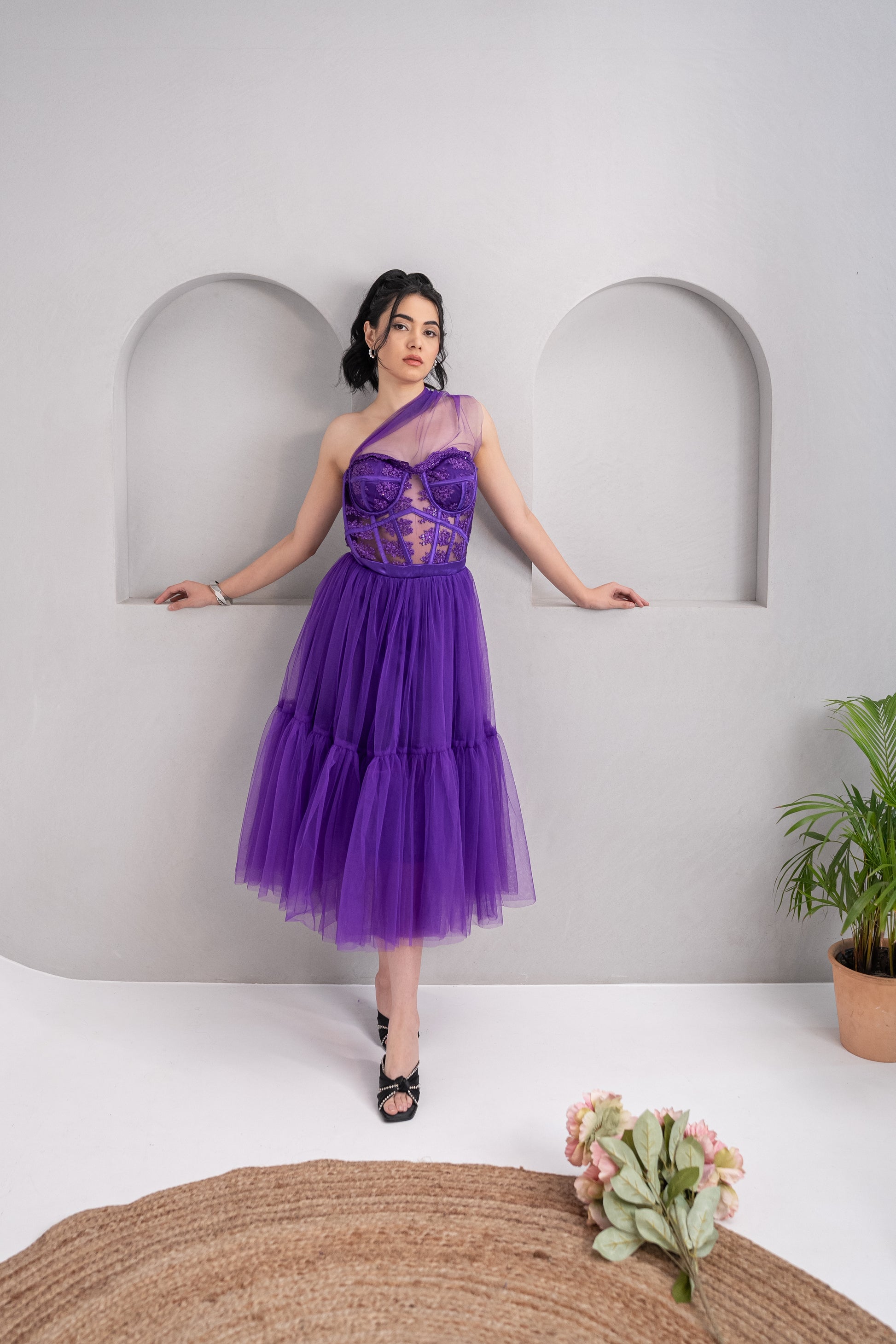 This stunning purple midi dress is designed to combine elegance with structure. The corset-style bodice features built-in boning and padding, offering exceptional support and a figure-flattering fit. Detailed lace accents on the bodice add a touch of sophistication, while the asymmetrical one-shoulder tulle overlay provides a modern, dramatic flair. The layered tulle skirt enhances the dress’s voluminous and graceful silhouette, making it perfect for creating a statement look.