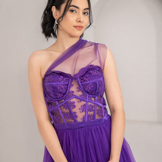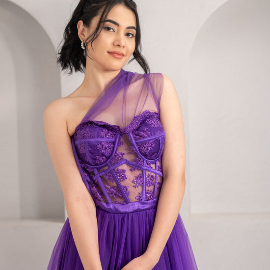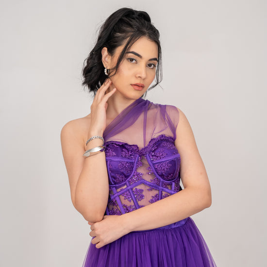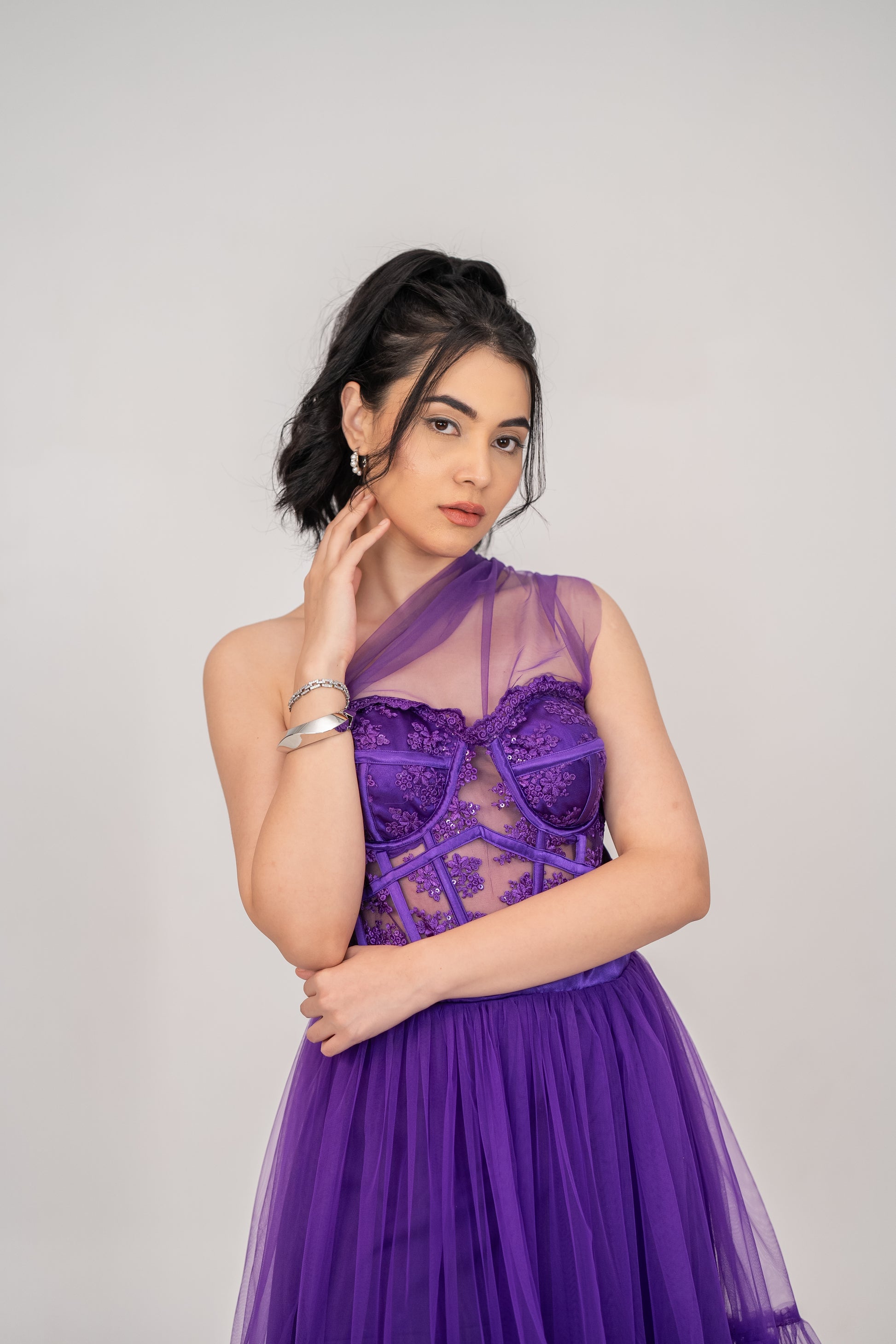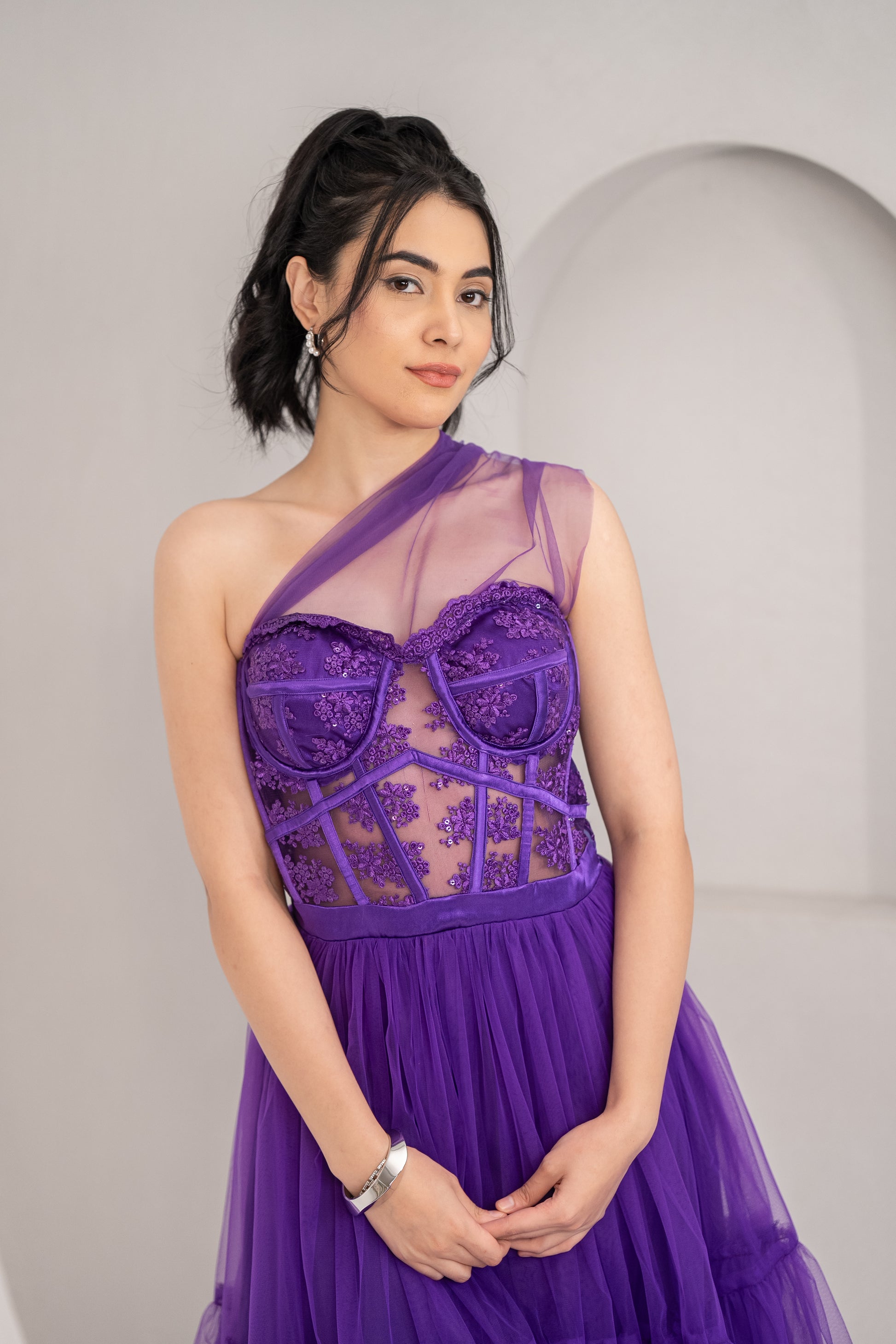 This stunning purple midi dress is designed to combine elegance with structure. The corset-style bodice features built-in boning and padding, offering exceptional support and a figure-flattering fit. Detailed lace accents on the bodice add a touch of sophistication, while the asymmetrical one-shoulder tulle overlay provides a modern, dramatic flair. The layered tulle skirt enhances the dress’s voluminous and graceful silhouette, making it perfect for creating a statement look.