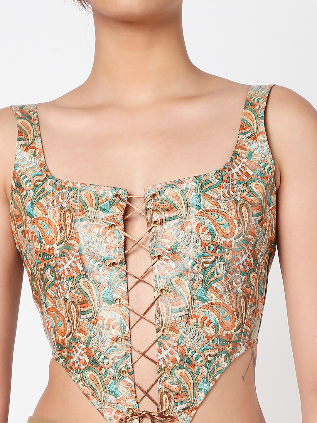 The Paisley Print Leather Corset Top is a perfect addition to elevate your wardrobe with its timeless appeal and stylish comfort.