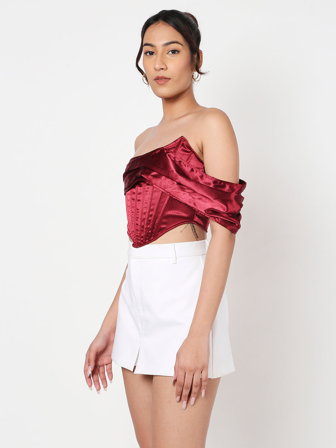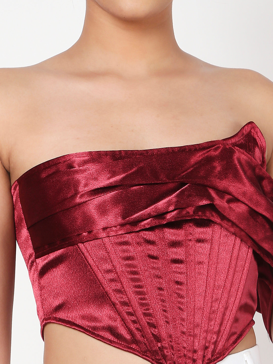 • Fabric: Made from premium maroon satin with pleating and boning for added structure and shape.