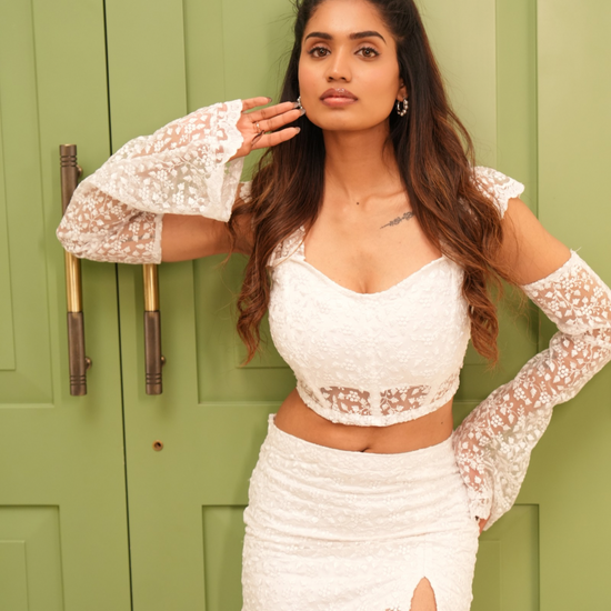 Our snow petal top and skirt is Ethereal and elegant, our Snow Petal Lace Set is a dreamy ensemble crafted from delicate white floral lace. The structured corset top features a sculpted bodice with boning, offering a flattering fit, while the lace-up back adds a romantic touch. Paired with a flowing lace skirt, this set is perfect for making a statement with grace and femininity.
