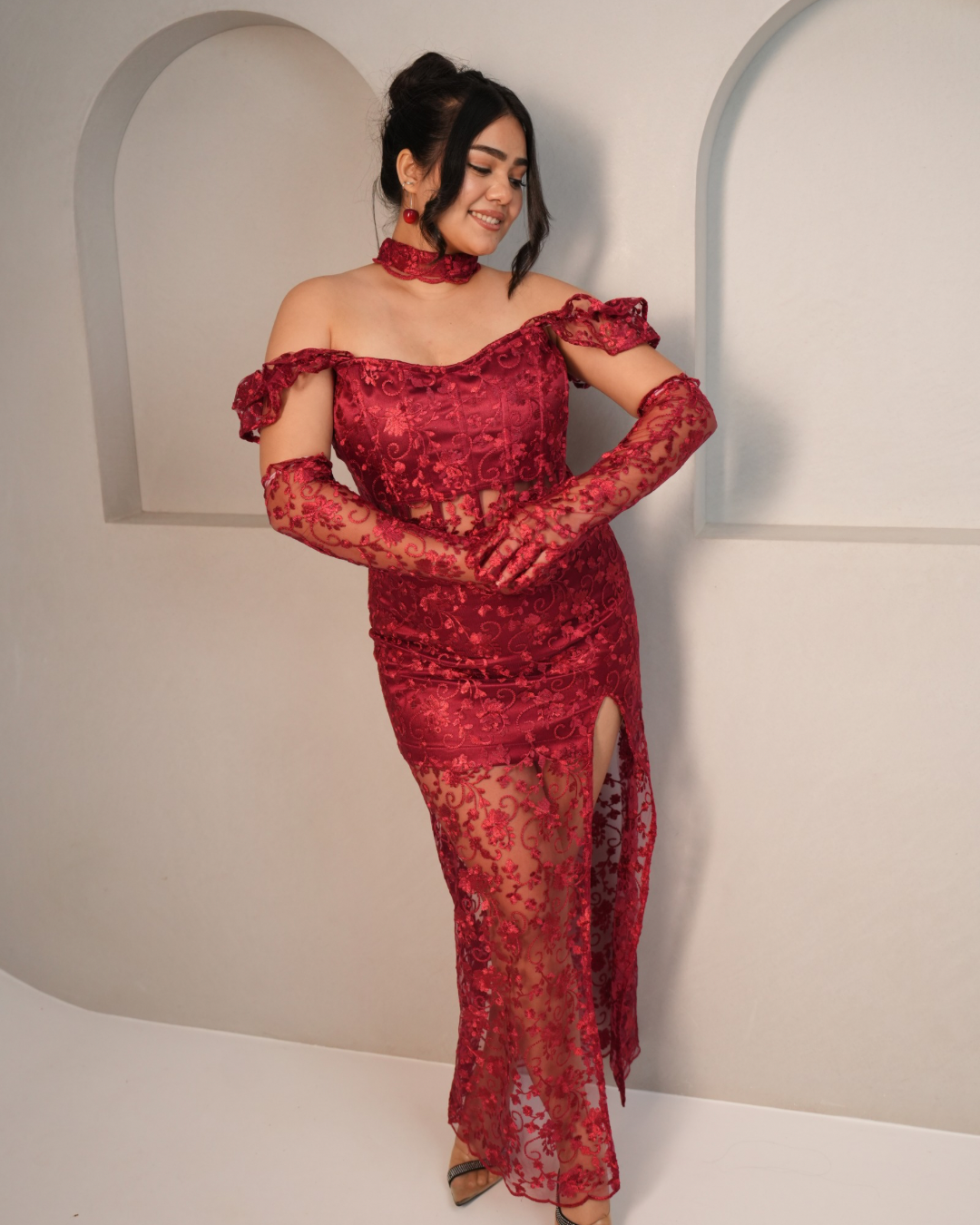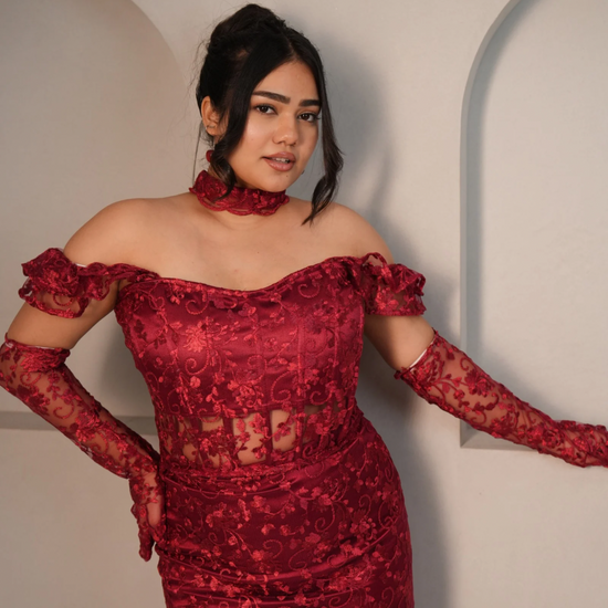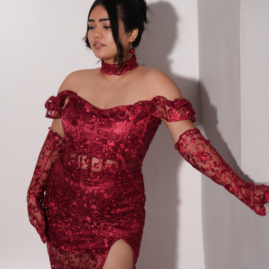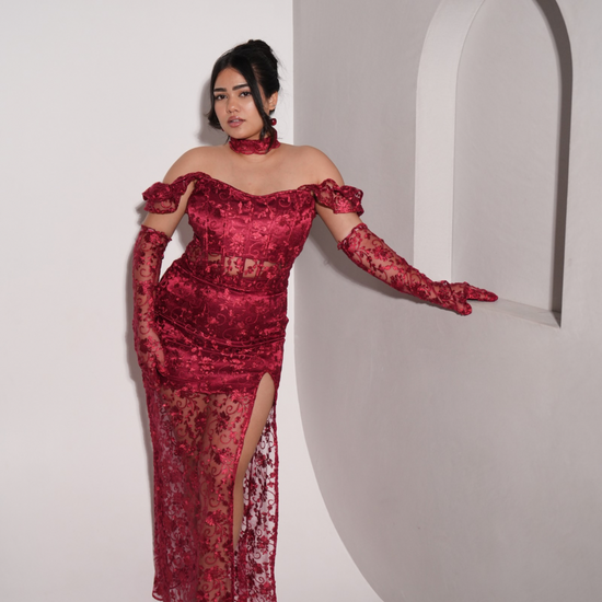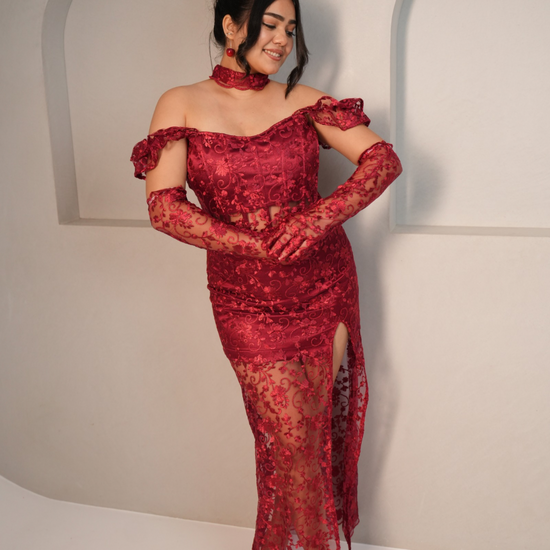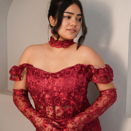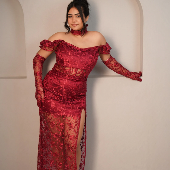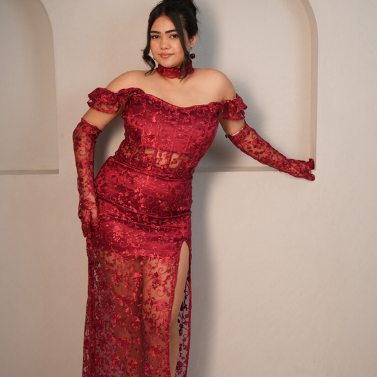 Our blood Bath top and long skirt is Fierce, bold, and irresistibly sultry, our Blood Bath Lace Set is designed to make a powerful statement. Crafted from exquisite red floral lace, this ensemble features a sculpted corset top with boning for structure, a lace-up back for an adjustable fit, and a matching high-slit lace skirt that adds drama and elegance. Completing the look, the sheer lace gloves bring a touch of vintage glamour, making this the ultimate show-stopping outfit.