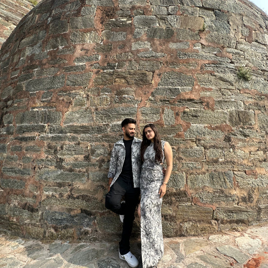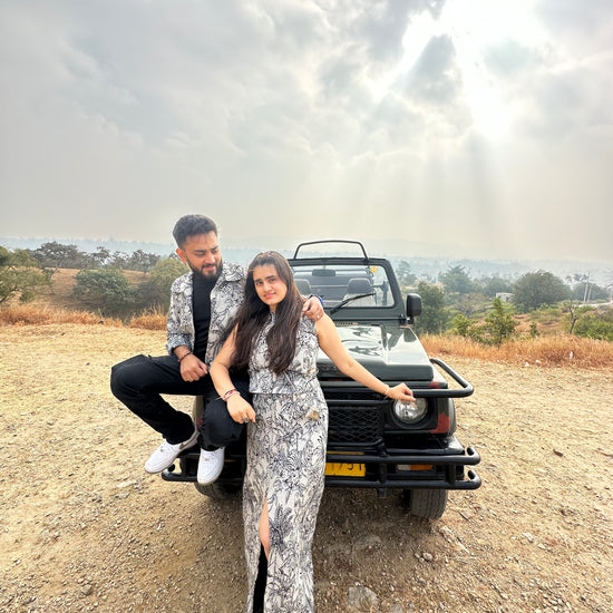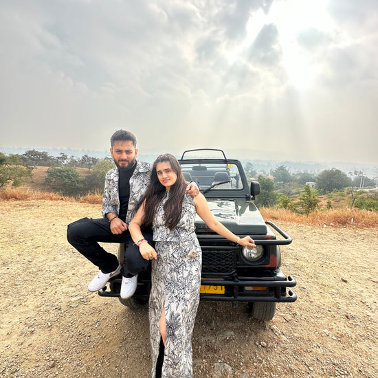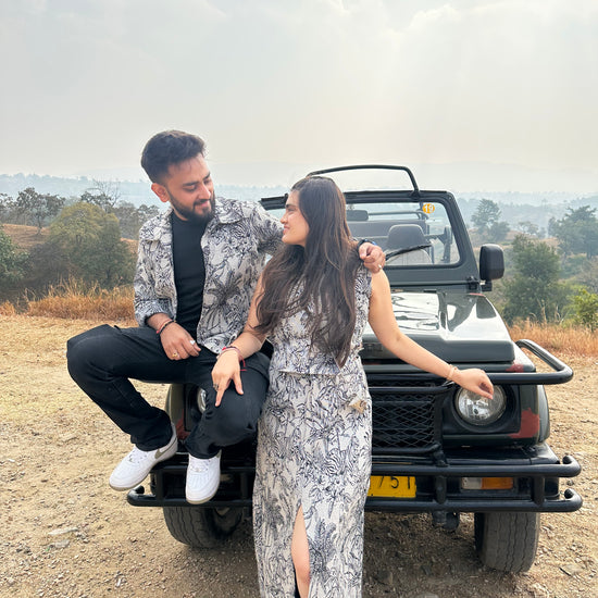 Unleash your wild side with the Wild Trails couple outfit ā a perfect match for nature lovers and explorers at heart. Featuring a monochrome jungle print, this coordinated set blends contemporary style with untamed elegance. The womanās slit dress flows effortlessly, while the manās shirt adds rugged charm to any outdoor escape.