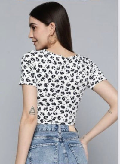 Elevate your casual wardrobe with this White Crop Top featuring a delicate flower print. Designed for effortless style and everyday comfort, this versatile piece is perfect for layering or wearing solo.