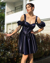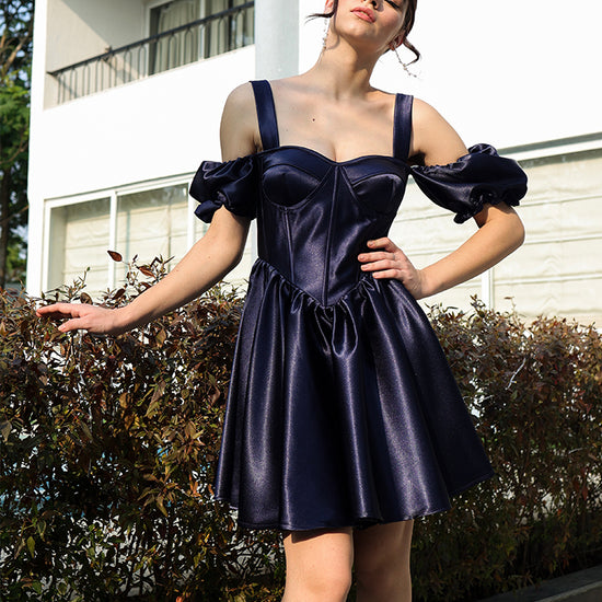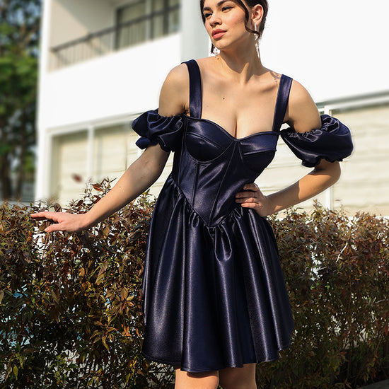 Our Xena mini dress is a glamorous work of art. Cut from satin, it has a flattering withstrap neckline, and the boned bodice is softened by the gathered overlay and draped panel that falls effortlessly passed the hem, highlighting just how glossy the satin is. It skims over your curves and zips to the back for easy on.