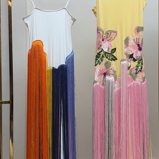Elevate your eveningwear with this handcrafted yellow fringe gown, an artistic fusion of texture, color, and modern couture craftsmanship. The strapless silhouette features a structured ivory bodice that gracefully transitions into a cascade of multicolored thread fringes in vivid shades